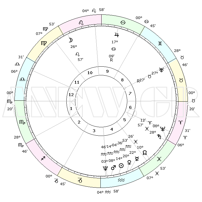 | | ΘΕΣΕΙΣ ΠΛΑΝΗΤΩΝ ΑΣΤΡΟΛΟΓΙΚΟΥ ΧΑΡΤΗ ΤΗΣ ΣΤΙΓΜΗΣ ΑΥΤΗΣ | | | | Πλανήτης | Ζώδιο | Μοίρες | Δεκαήμ. | Σε οίκο | Απόκλιση | | Ακμές των οίκων | | Ηλιος | Υδροχόος | 14°01' | Δεύτερο | 4 | 16 S 37 | | 1ος | 14°42' | Ζυγός | | Σελήνη | Λέων | 26°13' | Τρίτο | 11 | 13 N 52 | | 2ος | 12°14' | Σκορπιός | | Ερμής | Υδροχόος | 22°47' | Τρίτο | 5 | 15 S 34 | | 3ος | 13°16' | Τοξότης | | Αφροδίτη | Υδροχόος | 20°32' | Τρίτο | 5 | 15 S 58 | | 4ος | 16°37' | Αιγόκερως | | Αρης | Υδροχόος | 08°12' | Πρώτο | 4 | 19 S 13 | | 5ος | 19°33' | Υδροχόος | | Δίας | Καρκίνος | 17°09'R | Δεύτερο | 10 | 22 N 38 | | 6ος | 19°19' | Ιχθείς | | Κρόνος | Ιχθείς | 28°57' | Τρίτο | 6 | 02 S 25 | | 7ος | 14°42' | Κριός | | Ουρανός | Ταύρος | 27°27'R | Τρίτο | 8 | 19 N 24 | | 8ος | 12°14' | Ταύρος | | Ποσειδώνας | Κριός | 00°12' | Πρώτο | 6 | 01 S 08 | | 9ος | 13°16' | Δίδυμοι | | Πλούτωνας | Υδροχόος | 03°46' | Πρώτο | 4 | 23 S 01 | | 10ος | 16°37' | Καρκίνος | | Β. Δεσμός | Ιχθείς | 10°26' | Δεύτερο | 5 | 07 S 39 | | 11ος | 19°33' | Λέων | | Ωροσκόπος | Ζυγός | 14°42' | Δεύτερο | | | 12ος | 19°19' | Παρθένος | | Μεσουράνημα | Καρκίνος | 16°37' | Δεύτερο | | | |