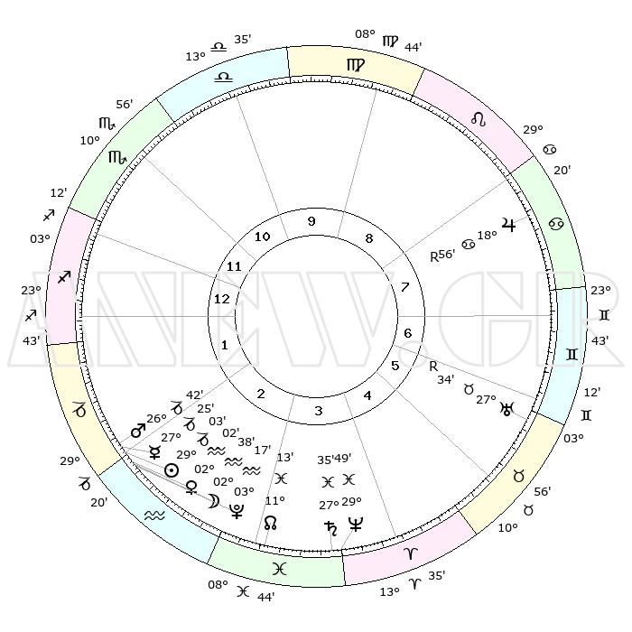| | ΘΕΣΕΙΣ ΠΛΑΝΗΤΩΝ ΑΣΤΡΟΛΟΓΙΚΟΥ ΧΑΡΤΗ ΤΗΣ ΣΤΙΓΜΗΣ ΑΥΤΗΣ | | | | Πλανήτης | Ζώδιο | Μοίρες | Δεκαήμ. | Σε οίκο | Απόκλιση | | Ακμές των οίκων | | Ηλιος | Αιγόκερως | 28°59' | Τρίτο | 2 | 20 S 21 | | 1ος | 01°35' | Τοξότης | | Σελήνη | Υδροχόος | 01°43' | Πρώτο | 2 | 22 S 51 | | 2ος | 02°57' | Αιγόκερως | | Ερμής | Αιγόκερως | 27°18' | Τρίτο | 2 | 22 S 38 | | 3ος | 08°55' | Υδροχόος | | Αφροδίτη | Υδροχόος | 01°57' | Πρώτο | 2 | 20 S 47 | | 4ος | 14°59' | Ιχθείς | | Αρης | Αιγόκερως | 26°39' | Τρίτο | 2 | 21 S 48 | | 5ος | 15°49' | Κριός | | Δίας | Καρκίνος | 18°56'R | Δεύτερο | 8 | 22 N 22 | | 6ος | 10°39' | Ταύρος | | Κρόνος | Ιχθείς | 27°34' | Τρίτο | 4 | 02 S 59 | | 7ος | 01°35' | Δίδυμοι | | Ουρανός | Ταύρος | 27°34'R | Τρίτο | 6 | 19 N 25 | | 8ος | 02°57' | Καρκίνος | | Ποσειδώνας | Ιχθείς | 29°49' | Τρίτο | 4 | 01 S 17 | | 9ος | 08°55' | Λέων | | Πλούτωνας | Υδροχόος | 03°17' | Πρώτο | 2 | 23 S 06 | | 10ος | 14°59' | Παρθένος | | Β. Δεσμός | Ιχθείς | 11°13' | Δεύτερο | 3 | 07 S 21 | | 11ος | 15°49' | Ζυγός | | Ωροσκόπος | Τοξότης | 01°35' | Πρώτο | | | 12ος | 10°39' | Σκορπιός | | Μεσουράνημα | Παρθένος | 14°59' | Δεύτερο | | | |