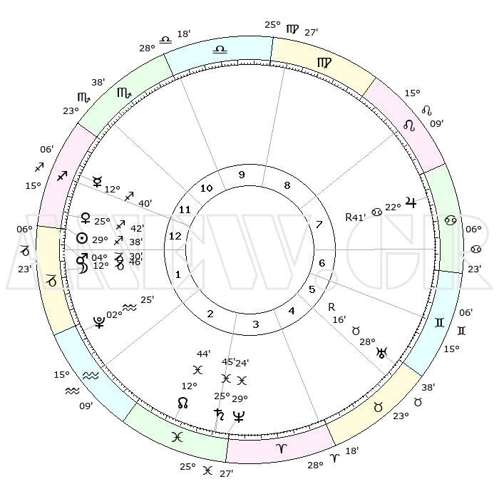 | | ΘΕΣΕΙΣ ΠΛΑΝΗΤΩΝ ΑΣΤΡΟΛΟΓΙΚΟΥ ΧΑΡΤΗ ΤΗΣ ΣΤΙΓΜΗΣ ΑΥΤΗΣ | | | | Πλανήτης | Ζώδιο | Μοίρες | Δεκαήμ. | Σε οίκο | Απόκλιση | | Ακμές των οίκων | | Ηλιος | Τοξότης | 29°33' | Τρίτο | 1 | 23 S 26 | | 1ος | 14°38' | Τοξότης | | Σελήνη | Αιγόκερως | 11°57' | Δεύτερο | 1 | 27 S 13 | | 2ος | 18°15' | Αιγόκερως | | Ερμής | Τοξότης | 12°34' | Δεύτερο | 12 | 21 S 34 | | 3ος | 26°24' | Υδροχόος | | Αφροδίτη | Τοξότης | 25°37' | Τρίτο | 1 | 23 S 27 | | 4ος | 02°09' | Κριός | | Αρης | Αιγόκερως | 04°27' | Πρώτο | 1 | 24 S 11 | | 5ος | 01°01' | Ταύρος | | Δίας | Καρκίνος | 22°42'R | Τρίτο | 8 | 21 N 44 | | 6ος | 24°12' | Ταύρος | | Κρόνος | Ιχθείς | 25°45' | Τρίτο | 3 | 03 S 48 | | 7ος | 14°38' | Δίδυμοι | | Ουρανός | Ταύρος | 28°17'R | Τρίτο | 6 | 19 N 35 | | 8ος | 18°15' | Καρκίνος | | Ποσειδώνας | Ιχθείς | 29°24' | Τρίτο | 3 | 01 S 28 | | 9ος | 26°24' | Λέων | | Πλούτωνας | Υδροχόος | 02°25' | Πρώτο | 2 | 23 S 17 | | 10ος | 02°09' | Ζυγός | | Β. Δεσμός | Ιχθείς | 12°45' | Δεύτερο | 3 | 06 S 47 | | 11ος | 01°01' | Σκορπιός | | Ωροσκόπος | Τοξότης | 14°38' | Δεύτερο | | | 12ος | 24°12' | Σκορπιός | | Μεσουράνημα | Ζυγός | 02°09' | Πρώτο | | | |