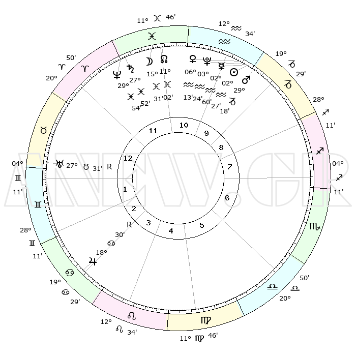 | | ΘΕΣΕΙΣ ΠΛΑΝΗΤΩΝ ΑΣΤΡΟΛΟΓΙΚΟΥ ΧΑΡΤΗ ΤΗΣ ΣΤΙΓΜΗΣ ΑΥΤΗΣ | | | | Πλανήτης | Ζώδιο | Μοίρες | Δεκαήμ. | Σε οίκο | Απόκλιση | | Ακμές των οίκων | | Ηλιος | Υδροχόος | 02°23' | Πρώτο | 10 | 19 S 37 | | 1ος | 03°23' | Ταύρος | | Σελήνη | Ιχθείς | 14°39' | Δεύτερο | 11 | 05 S 36 | | 2ος | 04°41' | Δίδυμοι | | Ερμής | Υδροχόος | 02°53' | Πρώτο | 10 | 21 S 31 | | 3ος | 27°54' | Δίδυμοι | | Αφροδίτη | Υδροχόος | 06°08' | Πρώτο | 10 | 19 S 52 | | 4ος | 19°36' | Καρκίνος | | Αρης | Αιγόκερως | 29°15' | Τρίτο | 10 | 21 S 17 | | 5ος | 14°21' | Λέων | | Δίας | Καρκίνος | 18°30'R | Δεύτερο | 3 | 22 N 26 | | 6ος | 17°45' | Παρθένος | | Κρόνος | Ιχθείς | 27°52' | Τρίτο | 12 | 02 S 52 | | 7ος | 03°23' | Σκορπιός | | Ουρανός | Ταύρος | 27°32'R | Τρίτο | 1 | 19 N 25 | | 8ος | 04°41' | Τοξότης | | Ποσειδώνας | Ιχθείς | 29°54' | Τρίτο | 12 | 01 S 15 | | 9ος | 27°54' | Τοξότης | | Πλούτωνας | Υδροχόος | 03°24' | Πρώτο | 10 | 23 S 05 | | 10ος | 19°36' | Αιγόκερως | | Β. Δεσμός | Ιχθείς | 11°02' | Δεύτερο | 11 | 07 S 26 | | 11ος | 14°21' | Υδροχόος | | Ωροσκόπος | Ταύρος | 03°23' | Πρώτο | | | 12ος | 17°45' | Ιχθείς | | Μεσουράνημα | Αιγόκερως | 19°36' | Δεύτερο | | | |