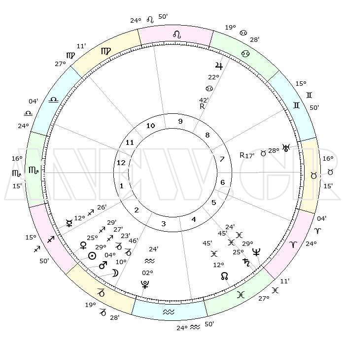 | | ΘΕΣΕΙΣ ΠΛΑΝΗΤΩΝ ΑΣΤΡΟΛΟΓΙΚΟΥ ΧΑΡΤΗ ΤΗΣ ΣΤΙΓΜΗΣ ΑΥΤΗΣ | | | | Πλανήτης | Ζώδιο | Μοίρες | Δεκαήμ. | Σε οίκο | Απόκλιση | | Ακμές των οίκων | | Ηλιος | Τοξότης | 29°19' | Τρίτο | 3 | 23 S 26 | | 1ος | 06°56' | Ζυγός | | Σελήνη | Αιγόκερως | 09°08' | Πρώτο | 4 | 27 S 34 | | 2ος | 03°60' | Σκορπιός | | Ερμής | Τοξότης | 12°14' | Δεύτερο | 3 | 21 S 29 | | 3ος | 04°42' | Τοξότης | | Αφροδίτη | Τοξότης | 25°19' | Τρίτο | 3 | 23 S 26 | | 4ος | 07°48' | Αιγόκερως | | Αρης | Αιγόκερως | 04°17' | Πρώτο | 3 | 24 S 11 | | 5ος | 10°44' | Υδροχόος | | Δίας | Καρκίνος | 22°43'R | Τρίτο | 10 | 21 N 44 | | 6ος | 10°53' | Ιχθείς | | Κρόνος | Ιχθείς | 25°45' | Τρίτο | 6 | 03 S 48 | | 7ος | 06°56' | Κριός | | Ουρανός | Ταύρος | 28°17'R | Τρίτο | 8 | 19 N 35 | | 8ος | 03°60' | Ταύρος | | Ποσειδώνας | Ιχθείς | 29°24' | Τρίτο | 6 | 01 S 28 | | 9ος | 04°42' | Δίδυμοι | | Πλούτωνας | Υδροχόος | 02°24' | Πρώτο | 4 | 23 S 17 | | 10ος | 07°48' | Καρκίνος | | Β. Δεσμός | Ιχθείς | 12°45' | Δεύτερο | 6 | 06 S 46 | | 11ος | 10°44' | Λέων | | Ωροσκόπος | Ζυγός | 06°56' | Πρώτο | | | 12ος | 10°53' | Παρθένος | | Μεσουράνημα | Καρκίνος | 07°48' | Πρώτο | | | |