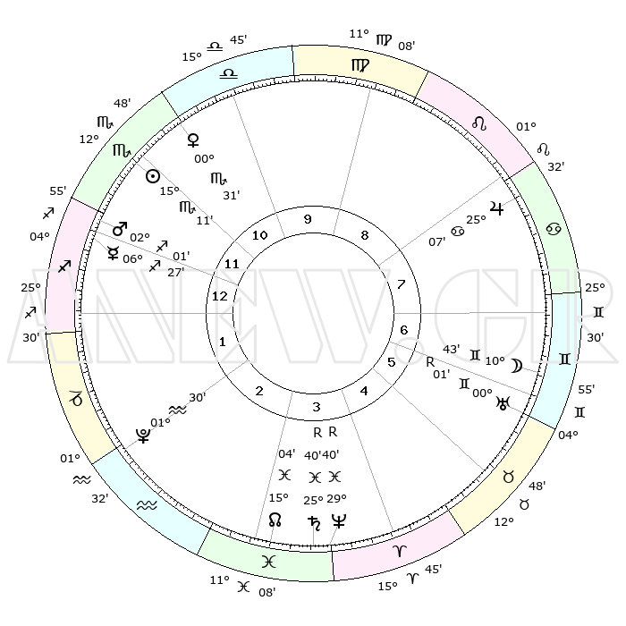 | | ΘΕΣΕΙΣ ΠΛΑΝΗΤΩΝ ΑΣΤΡΟΛΟΓΙΚΟΥ ΧΑΡΤΗ ΤΗΣ ΣΤΙΓΜΗΣ ΑΥΤΗΣ | | | | Πλανήτης | Ζώδιο | Μοίρες | Δεκαήμ. | Σε οίκο | Απόκλιση | | Ακμές των οίκων | | Ηλιος | Σκορπιός | 15°05' | Δεύτερο | 12 | 16 S 21 | | 1ος | 27°56' | Σκορπιός | | Σελήνη | Δίδυμοι | 09°20' | Πρώτο | 7 | 26 N 49 | | 2ος | 28°47' | Τοξότης | | Ερμής | Τοξότης | 06°25' | Πρώτο | 1 | 24 S 00 | | 3ος | 04°09' | Υδροχόος | | Αφροδίτη | Σκορπιός | 00°24' | Πρώτο | 11 | 10 S 19 | | 4ος | 10°08' | Ιχθείς | | Αρης | Τοξότης | 01°57' | Πρώτο | 1 | 20 S 59 | | 5ος | 11°25' | Κριός | | Δίας | Καρκίνος | 25°07' | Τρίτο | 8 | 21 N 12 | | 6ος | 06°45' | Ταύρος | | Κρόνος | Ιχθείς | 25°40'R | Τρίτο | 4 | 03 S 58 | | 7ος | 27°56' | Ταύρος | | Ουρανός | Δίδυμοι | 00°02'R | Πρώτο | 7 | 19 N 57 | | 8ος | 28°47' | Δίδυμοι | | Ποσειδώνας | Ιχθείς | 29°40'R | Τρίτο | 4 | 01 S 23 | | 9ος | 04°09' | Λέων | | Πλούτωνας | Υδροχόος | 01°30' | Πρώτο | 2 | 23 S 30 | | 10ος | 10°08' | Παρθένος | | Β. Δεσμός | Ιχθείς | 15°04' | Δεύτερο | 4 | 05 S 53 | | 11ος | 11°25' | Ζυγός | | Ωροσκόπος | Σκορπιός | 27°56' | Τρίτο | | | 12ος | 06°45' | Σκορπιός | | Μεσουράνημα | Παρθένος | 10°08' | Δεύτερο | | | |