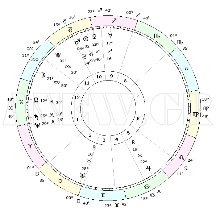 | | ΘΕΣΕΙΣ ΠΛΑΝΗΤΩΝ ΑΣΤΡΟΛΟΓΙΚΟΥ ΧΑΡΤΗ ΤΗΣ ΣΤΙΓΜΗΣ ΑΥΤΗΣ | | | | Πλανήτης | Ζώδιο | Μοίρες | Δεκαήμ. | Σε οίκο | Απόκλιση | | Ακμές των οίκων | | Ηλιος | Αιγόκερως | 02°39' | Πρώτο | 1 | 23 S 24 | | 1ος | 28°50' | Τοξότης | | Σελήνη | Υδροχόος | 19°34' | Δεύτερο | 2 | 16 S 44 | | 2ος | 05°41' | Υδροχόος | | Ερμής | Τοξότης | 16°60' | Δεύτερο | 12 | 22 S 27 | | 3ος | 15°36' | Ιχθείς | | Αφροδίτη | Τοξότης | 29°26' | Τρίτο | 1 | 23 S 38 | | 4ος | 19°44' | Κριός | | Αρης | Αιγόκερως | 06°46' | Πρώτο | 1 | 24 S 06 | | 5ος | 16°14' | Ταύρος | | Δίας | Καρκίνος | 22°20'R | Τρίτο | 7 | 21 N 48 | | 6ος | 08°06' | Δίδυμοι | | Κρόνος | Ιχθείς | 25°53' | Τρίτο | 3 | 03 S 44 | | 7ος | 28°50' | Δίδυμοι | | Ουρανός | Ταύρος | 28°11'R | Τρίτο | 5 | 19 N 33 | | 8ος | 05°41' | Λέων | | Ποσειδώνας | Ιχθείς | 29°26' | Τρίτο | 3 | 01 S 27 | | 9ος | 15°36' | Παρθένος | | Πλούτωνας | Υδροχόος | 02°30' | Πρώτο | 1 | 23 S 16 | | 10ος | 19°43' | Ζυγός | | Β. Δεσμός | Ιχθείς | 12°35' | Δεύτερο | 2 | 06 S 50 | | 11ος | 16°14' | Σκορπιός | | Ωροσκόπος | Τοξότης | 28°50' | Τρίτο | | | 12ος | 08°06' | Τοξότης | | Μεσουράνημα | Ζυγός | 19°43' | Δεύτερο | | | |