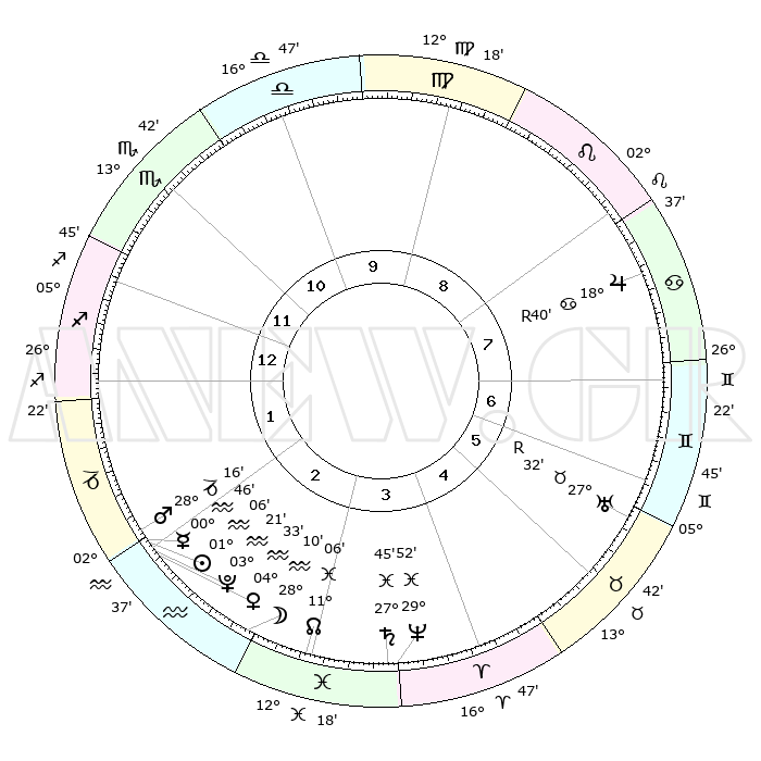 | | ΘΕΣΕΙΣ ΠΛΑΝΗΤΩΝ ΑΣΤΡΟΛΟΓΙΚΟΥ ΧΑΡΤΗ ΤΗΣ ΣΤΙΓΜΗΣ ΑΥΤΗΣ | | | | Πλανήτης | Ζώδιο | Μοίρες | Δεκαήμ. | Σε οίκο | Απόκλιση | | Ακμές των οίκων | | Ηλιος | Υδροχόος | 01°01' | Πρώτο | 2 | 19 S 56 | | 1ος | 03°12' | Τοξότης | | Σελήνη | Υδροχόος | 27°11' | Τρίτο | 3 | 13 S 28 | | 2ος | 04°47' | Αιγόκερως | | Ερμής | Υδροχόος | 00°38' | Πρώτο | 2 | 22 S 00 | | 3ος | 11°02' | Υδροχόος | | Αφροδίτη | Υδροχόος | 04°27' | Πρώτο | 2 | 20 S 15 | | 4ος | 17°07' | Ιχθείς | | Αρης | Αιγόκερως | 28°12' | Τρίτο | 2 | 21 S 30 | | 5ος | 17°44' | Κριός | | Δίας | Καρκίνος | 18°41'R | Δεύτερο | 8 | 22 N 25 | | 6ος | 12°21' | Ταύρος | | Κρόνος | Ιχθείς | 27°45' | Τρίτο | 4 | 02 S 55 | | 7ος | 03°12' | Δίδυμοι | | Ουρανός | Ταύρος | 27°33'R | Τρίτο | 6 | 19 N 25 | | 8ος | 04°47' | Καρκίνος | | Ποσειδώνας | Ιχθείς | 29°52' | Τρίτο | 4 | 01 S 16 | | 9ος | 11°02' | Λέων | | Πλούτωνας | Υδροχόος | 03°21' | Πρώτο | 2 | 23 S 05 | | 10ος | 17°07' | Παρθένος | | Β. Δεσμός | Ιχθείς | 11°06' | Δεύτερο | 3 | 07 S 24 | | 11ος | 17°44' | Ζυγός | | Ωροσκόπος | Τοξότης | 03°12' | Πρώτο | | | 12ος | 12°21' | Σκορπιός | | Μεσουράνημα | Παρθένος | 17°07' | Δεύτερο | | | |