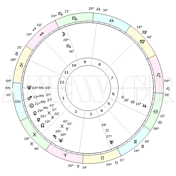 | | ΘΕΣΕΙΣ ΠΛΑΝΗΤΩΝ ΑΣΤΡΟΛΟΓΙΚΟΥ ΧΑΡΤΗ ΤΗΣ ΣΤΙΓΜΗΣ ΑΥΤΗΣ | | | | Πλανήτης | Ζώδιο | Μοίρες | Δεκαήμ. | Σε οίκο | Απόκλιση | | Ακμές των οίκων | | Ηλιος | Υδροχόος | 21°19' | Τρίτο | 2 | 14 S 23 | | 1ος | 19°01' | Τοξότης | | Σελήνη | Σκορπιός | 27°08' | Τρίτο | 11 | 24 S 31 | | 2ος | 23°34' | Αιγόκερως | | Ερμής | Ιχθείς | 05°24' | Πρώτο | 3 | 10 S 22 | | 3ος | 02°22' | Ιχθείς | | Αφροδίτη | Υδροχόος | 29°33' | Τρίτο | 2 | 12 S 59 | | 4ος | 07°45' | Κριός | | Αρης | Υδροχόος | 13°51' | Δεύτερο | 2 | 17 S 41 | | 5ος | 05°53' | Ταύρος | | Δίας | Καρκίνος | 16°26'R | Δεύτερο | 7 | 22 N 44 | | 6ος | 28°36' | Ταύρος | | Κρόνος | Ιχθείς | 29°41' | Τρίτο | 3 | 02 S 06 | | 7ος | 19°01' | Δίδυμοι | | Ουρανός | Ταύρος | 27°28' | Τρίτο | 5 | 19 N 25 | | 8ος | 23°34' | Καρκίνος | | Ποσειδώνας | Κριός | 00°25' | Πρώτο | 3 | 01 S 02 | | 9ος | 02°22' | Παρθένος | | Πλούτωνας | Υδροχόος | 03°59' | Πρώτο | 2 | 22 S 58 | | 10ος | 07°45' | Ζυγός | | Β. Δεσμός | Ιχθείς | 10°03' | Δεύτερο | 3 | 07 S 48 | | 11ος | 05°53' | Σκορπιός | | Ωροσκόπος | Τοξότης | 19°01' | Δεύτερο | | | 12ος | 28°36' | Σκορπιός | | Μεσουράνημα | Ζυγός | 07°45' | Πρώτο | | | |