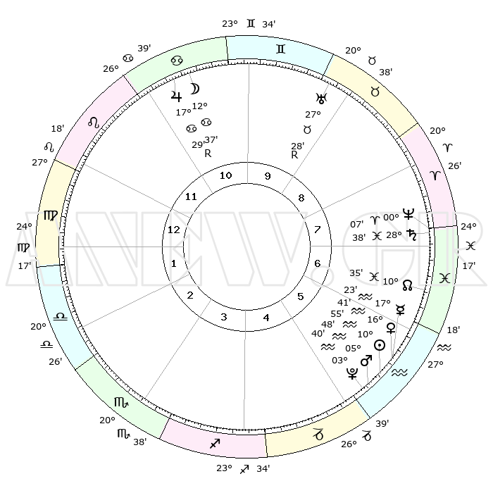| | ΘΕΣΕΙΣ ΠΛΑΝΗΤΩΝ ΑΣΤΡΟΛΟΓΙΚΟΥ ΧΑΡΤΗ ΤΗΣ ΣΤΙΓΜΗΣ ΑΥΤΗΣ | | | | Πλανήτης | Ζώδιο | Μοίρες | Δεκαήμ. | Σε οίκο | Απόκλιση | | Ακμές των οίκων | | Ηλιος | Υδροχόος | 10°51' | Δεύτερο | 6 | 17 S 30 | | 1ος | 07°45' | Παρθένος | | Σελήνη | Καρκίνος | 11°48' | Δεύτερο | 11 | 27 N 17 | | 2ος | 02°24' | Ζυγός | | Ερμής | Υδροχόος | 17°17' | Δεύτερο | 6 | 17 S 31 | | 3ος | 01°42' | Σκορπιός | | Αφροδίτη | Υδροχόος | 16°37' | Δεύτερο | 6 | 17 S 08 | | 4ος | 04°39' | Τοξότης | | Αρης | Υδροχόος | 05°45' | Πρώτο | 5 | 19 S 50 | | 5ος | 08°22' | Αιγόκερως | | Δίας | Καρκίνος | 17°30'R | Δεύτερο | 11 | 22 N 35 | | 6ος | 09°47' | Υδροχόος | | Κρόνος | Ιχθείς | 28°38' | Τρίτο | 7 | 02 S 32 | | 7ος | 07°45' | Ιχθείς | | Ουρανός | Ταύρος | 27°28'R | Τρίτο | 9 | 19 N 24 | | 8ος | 02°24' | Κριός | | Ποσειδώνας | Κριός | 00°07' | Πρώτο | 7 | 01 S 10 | | 9ος | 01°42' | Ταύρος | | Πλούτωνας | Υδροχόος | 03°40' | Πρώτο | 5 | 23 S 02 | | 10ος | 04°39' | Δίδυμοι | | Β. Δεσμός | Ιχθείς | 10°36' | Δεύτερο | 7 | 07 S 36 | | 11ος | 08°22' | Καρκίνος | | Ωροσκόπος | Παρθένος | 07°45' | Πρώτο | | | 12ος | 09°47' | Λέων | | Μεσουράνημα | Δίδυμοι | 04°39' | Πρώτο | | | |