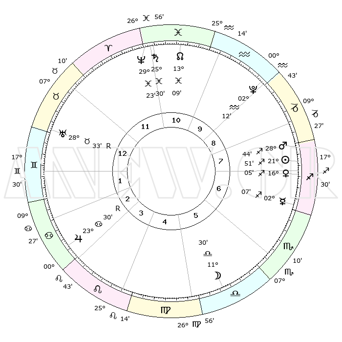 | | ΘΕΣΕΙΣ ΠΛΑΝΗΤΩΝ ΑΣΤΡΟΛΟΓΙΚΟΥ ΧΑΡΤΗ ΤΗΣ ΣΤΙΓΜΗΣ ΑΥΤΗΣ | | | | Πλανήτης | Ζώδιο | Μοίρες | Δεκαήμ. | Σε οίκο | Απόκλιση | | Ακμές των οίκων | | Ηλιος | Τοξότης | 21°47' | Τρίτο | 8 | 23 S 11 | | 1ος | 21°46' | Ταύρος | | Σελήνη | Ζυγός | 10°45' | Δεύτερο | 6 | 06 S 24 | | 2ος | 18°22' | Δίδυμοι | | Ερμής | Τοξότης | 02°02' | Πρώτο | 7 | 18 S 53 | | 3ος | 10°10' | Καρκίνος | | Αφροδίτη | Τοξότης | 15°60' | Δεύτερο | 7 | 22 S 29 | | 4ος | 02°25' | Λέων | | Αρης | Τοξότης | 28°41' | Τρίτο | 8 | 24 S 11 | | 5ος | 29°32' | Λέων | | Δίας | Καρκίνος | 23°31'R | Τρίτο | 3 | 21 N 35 | | 6ος | 06°34' | Ζυγός | | Κρόνος | Ιχθείς | 25°29' | Τρίτο | 11 | 03 S 56 | | 7ος | 21°46' | Σκορπιός | | Ουρανός | Ταύρος | 28°33'R | Τρίτο | 1 | 19 N 38 | | 8ος | 18°22' | Τοξότης | | Ποσειδώνας | Ιχθείς | 29°23' | Τρίτο | 11 | 01 S 29 | | 9ος | 10°10' | Αιγόκερως | | Πλούτωνας | Υδροχόος | 02°12' | Πρώτο | 9 | 23 S 20 | | 10ος | 02°25' | Υδροχόος | | Β. Δεσμός | Ιχθείς | 13°09' | Δεύτερο | 11 | 06 S 37 | | 11ος | 29°32' | Υδροχόος | | Ωροσκόπος | Ταύρος | 21°46' | Τρίτο | | | 12ος | 06°34' | Κριός | | Μεσουράνημα | Υδροχόος | 02°25' | Πρώτο | | | |