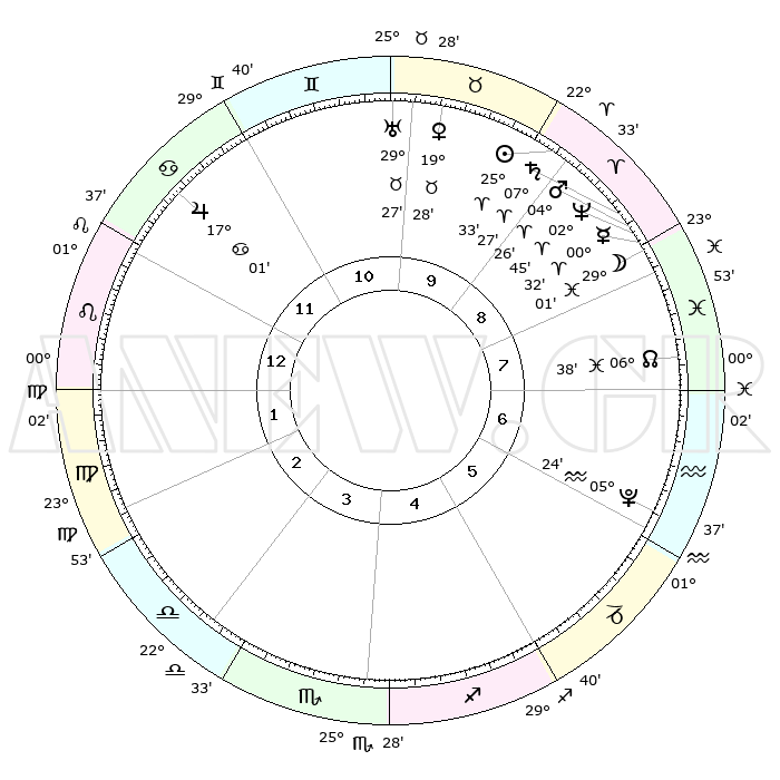 | | ΘΕΣΕΙΣ ΠΛΑΝΗΤΩΝ ΑΣΤΡΟΛΟΓΙΚΟΥ ΧΑΡΤΗ ΤΗΣ ΣΤΙΓΜΗΣ ΑΥΤΗΣ | | | | Πλανήτης | Ζώδιο | Μοίρες | Δεκαήμ. | Σε οίκο | Απόκλιση | | Ακμές των οίκων | | Ηλιος | Κριός | 25°29' | Τρίτο | 9 | 09 N 51 | | 1ος | 08°05' | Λέων | | Σελήνη | Ιχθείς | 27°57' | Τρίτο | 9 | 00 N 47 | | 2ος | 29°45' | Λέων | | Ερμής | Κριός | 00°26' | Πρώτο | 9 | 02 S 13 | | 3ος | 25°54' | Παρθένος | | Αφροδίτη | Ταύρος | 19°22' | Δεύτερο | 10 | 17 N 45 | | 4ος | 27°48' | Ζυγός | | Αρης | Κριός | 04°23' | Πρώτο | 9 | 00 N 50 | | 5ος | 03°31' | Τοξότης | | Δίας | Καρκίνος | 17°01' | Δεύτερο | 12 | 22 N 44 | | 6ος | 07°57' | Αιγόκερως | | Κρόνος | Κριός | 07°26' | Πρώτο | 9 | 00 N 59 | | 7ος | 08°05' | Υδροχόος | | Ουρανός | Ταύρος | 29°27' | Τρίτο | 10 | 19 N 52 | | 8ος | 29°45' | Υδροχόος | | Ποσειδώνας | Κριός | 02°44' | Πρώτο | 9 | 00 S 07 | | 9ος | 25°54' | Ιχθείς | | Πλούτωνας | Υδροχόος | 05°24' | Πρώτο | 6 | 22 S 47 | | 10ος | 27°48' | Κριός | | Β. Δεσμός | Ιχθείς | 06°38' | Πρώτο | 8 | 09 S 04 | | 11ος | 03°31' | Δίδυμοι | | Ωροσκόπος | Λέων | 08°05' | Πρώτο | | | 12ος | 07°57' | Καρκίνος | | Μεσουράνημα | Κριός | 27°48' | Τρίτο | | | |