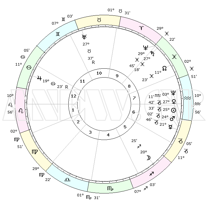 | | ΘΕΣΕΙΣ ΠΛΑΝΗΤΩΝ ΑΣΤΡΟΛΟΓΙΚΟΥ ΧΑΡΤΗ ΤΗΣ ΣΤΙΓΜΗΣ ΑΥΤΗΣ | | | | Πλανήτης | Ζώδιο | Μοίρες | Δεκαήμ. | Σε οίκο | Απόκλιση | | Ακμές των οίκων | | Ηλιος | Αιγόκερως | 25°29' | Τρίτο | 7 | 21 S 02 | | 1ος | 22°15' | Καρκίνος | | Σελήνη | Τοξότης | 19°39' | Δεύτερο | 5 | 28 S 04 | | 2ος | 12°52' | Λέων | | Ερμής | Αιγόκερως | 21°40' | Τρίτο | 6 | 23 S 29 | | 3ος | 06°54' | Παρθένος | | Αφροδίτη | Αιγόκερως | 27°38' | Τρίτο | 7 | 21 S 36 | | 4ος | 06°51' | Ζυγός | | Αρης | Αιγόκερως | 23°59' | Τρίτο | 7 | 22 S 16 | | 5ος | 12°55' | Σκορπιός | | Δίας | Καρκίνος | 19°24'R | Δεύτερο | 12 | 22 N 18 | | 6ος | 19°55' | Τοξότης | | Κρόνος | Ιχθείς | 27°18' | Τρίτο | 9 | 03 S 06 | | 7ος | 22°15' | Αιγόκερως | | Ουρανός | Ταύρος | 27°37'R | Τρίτο | 11 | 19 N 26 | | 8ος | 12°52' | Υδροχόος | | Ποσειδώνας | Ιχθείς | 29°45' | Τρίτο | 9 | 01 S 19 | | 9ος | 06°54' | Ιχθείς | | Πλούτωνας | Υδροχόος | 03°11' | Πρώτο | 7 | 23 S 08 | | 10ος | 06°51' | Κριός | | Β. Δεσμός | Ιχθείς | 11°24' | Δεύτερο | 9 | 07 S 17 | | 11ος | 12°55' | Ταύρος | | Ωροσκόπος | Καρκίνος | 22°15' | Τρίτο | | | 12ος | 19°55' | Δίδυμοι | | Μεσουράνημα | Κριός | 06°51' | Πρώτο | | | |