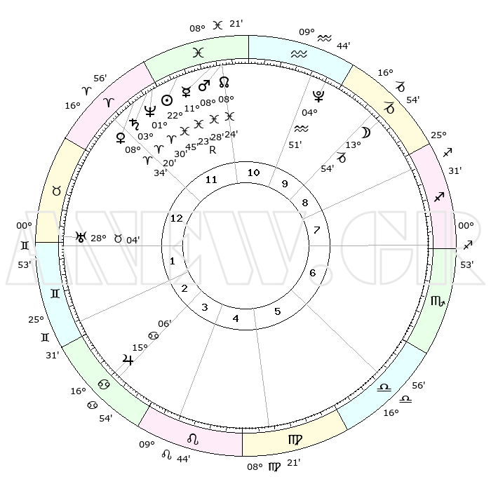 | | ΘΕΣΕΙΣ ΠΛΑΝΗΤΩΝ ΑΣΤΡΟΛΟΓΙΚΟΥ ΧΑΡΤΗ ΤΗΣ ΣΤΙΓΜΗΣ ΑΥΤΗΣ | | | | Πλανήτης | Ζώδιο | Μοίρες | Δεκαήμ. | Σε οίκο | Απόκλιση | | Ακμές των οίκων | | Ηλιος | Ιχθείς | 22°42' | Τρίτο | 12 | 02 S 54 | | 1ος | 06°30' | Ταύρος | | Σελήνη | Αιγόκερως | 13°16' | Δεύτερο | 9 | 27 S 06 | | 2ος | 06°57' | Δίδυμοι | | Ερμής | Ιχθείς | 11°25'R | Δεύτερο | 11 | 04 S 41 | | 3ος | 29°53' | Δίδυμοι | | Αφροδίτη | Κριός | 08°30' | Πρώτο | 12 | 02 N 22 | | 4ος | 21°38' | Καρκίνος | | Αρης | Ιχθείς | 08°25' | Πρώτο | 11 | 09 S 25 | | 5ος | 16°43' | Λέων | | Δίας | Καρκίνος | 15°06' | Δεύτερο | 3 | 22 N 56 | | 6ος | 20°44' | Παρθένος | | Κρόνος | Κριός | 03°20' | Πρώτο | 12 | 00 S 38 | | 7ος | 06°30' | Σκορπιός | | Ουρανός | Ταύρος | 28°03' | Τρίτο | 1 | 19 N 33 | | 8ος | 06°57' | Τοξότης | | Ποσειδώνας | Κριός | 01°30' | Πρώτο | 12 | 00 S 36 | | 9ος | 29°53' | Τοξότης | | Πλούτωνας | Υδροχόος | 04°51' | Πρώτο | 10 | 22 S 50 | | 10ος | 21°38' | Αιγόκερως | | Β. Δεσμός | Ιχθείς | 08°24' | Πρώτο | 11 | 08 S 25 | | 11ος | 16°43' | Υδροχόος | | Ωροσκόπος | Ταύρος | 06°30' | Πρώτο | | | 12ος | 20°44' | Ιχθείς | | Μεσουράνημα | Αιγόκερως | 21°38' | Τρίτο | | | |