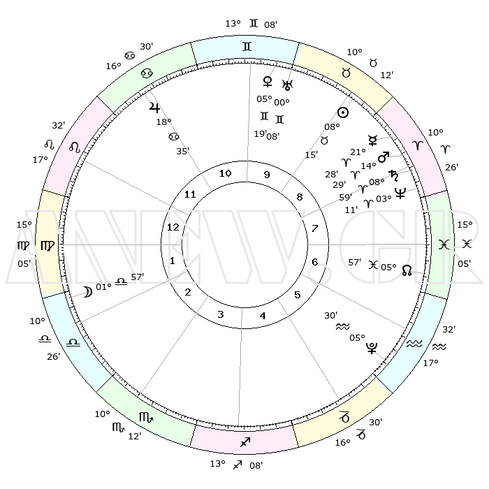 | | ΘΕΣΕΙΣ ΠΛΑΝΗΤΩΝ ΑΣΤΡΟΛΟΓΙΚΟΥ ΧΑΡΤΗ ΤΗΣ ΣΤΙΓΜΗΣ ΑΥΤΗΣ | | | | Πλανήτης | Ζώδιο | Μοίρες | Δεκαήμ. | Σε οίκο | Απόκλιση | | Ακμές των οίκων | | Ηλιος | Ταύρος | 08°12' | Πρώτο | 9 | 14 N 14 | | 1ος | 28°26' | Λέων | | Σελήνη | Ζυγός | 01°14' | Πρώτο | 2 | 02 S 23 | | 2ος | 22°07' | Παρθένος | | Ερμής | Κριός | 21°22' | Τρίτο | 9 | 06 N 19 | | 3ος | 20°39' | Ζυγός | | Αφροδίτη | Δίδυμοι | 05°14' | Πρώτο | 10 | 21 N 57 | | 4ος | 23°33' | Σκορπιός | | Αρης | Κριός | 14°27' | Δεύτερο | 8 | 04 N 52 | | 5ος | 27°51' | Τοξότης | | Δίας | Καρκίνος | 18°34' | Δεύτερο | 11 | 22 N 32 | | 6ος | 29°56' | Αιγόκερως | | Κρόνος | Κριός | 08°58' | Πρώτο | 8 | 01 N 34 | | 7ος | 28°26' | Υδροχόος | | Ουρανός | Δίδυμοι | 00°08' | Πρώτο | 10 | 20 N 01 | | 8ος | 22°07' | Ιχθείς | | Ποσειδώνας | Κριός | 03°11' | Πρώτο | 8 | 00 N 03 | | 9ος | 20°39' | Κριός | | Πλούτωνας | Υδροχόος | 05°30' | Πρώτο | 6 | 22 S 48 | | 10ος | 23°33' | Ταύρος | | Β. Δεσμός | Ιχθείς | 05°57' | Πρώτο | 7 | 09 S 20 | | 11ος | 27°51' | Δίδυμοι | | Ωροσκόπος | Λέων | 28°26' | Τρίτο | | | 12ος | 29°56' | Καρκίνος | | Μεσουράνημα | Ταύρος | 23°33' | Τρίτο | | | |