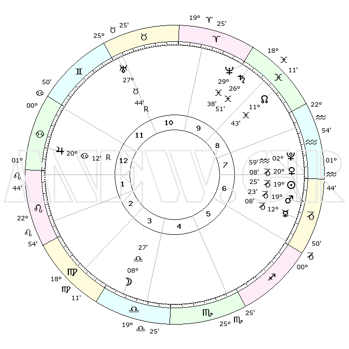 | | ΘΕΣΕΙΣ ΠΛΑΝΗΤΩΝ ΑΣΤΡΟΛΟΓΙΚΟΥ ΧΑΡΤΗ ΤΗΣ ΣΤΙΓΜΗΣ ΑΥΤΗΣ | | | | Πλανήτης | Ζώδιο | Μοίρες | Δεκαήμ. | Σε οίκο | Απόκλιση | | Ακμές των οίκων | | Ηλιος | Αιγόκερως | 18°43' | Δεύτερο | 3 | 22 S 08 | | 1ος | 01°17' | Σκορπιός | | Σελήνη | Παρθένος | 29°50' | Τρίτο | 11 | 01 S 30 | | 2ος | 29°47' | Σκορπιός | | Ερμής | Αιγόκερως | 11°03' | Δεύτερο | 3 | 24 S 19 | | 3ος | 01°50' | Αιγόκερως | | Αφροδίτη | Αιγόκερως | 19°16' | Δεύτερο | 3 | 22 S 50 | | 4ος | 06°07' | Υδροχόος | | Αρης | Αιγόκερως | 18°51' | Δεύτερο | 3 | 23 S 02 | | 5ος | 09°01' | Ιχθείς | | Δίας | Καρκίνος | 20°17'R | Τρίτο | 9 | 22 N 09 | | 6ος | 07°34' | Κριός | | Κρόνος | Ιχθείς | 26°48' | Τρίτο | 5 | 03 S 19 | | 7ος | 01°17' | Ταύρος | | Ουρανός | Ταύρος | 27°45'R | Τρίτο | 7 | 19 N 28 | | 8ος | 29°47' | Ταύρος | | Ποσειδώνας | Ιχθείς | 29°38' | Τρίτο | 5 | 01 S 22 | | 9ος | 01°50' | Καρκίνος | | Πλούτωνας | Υδροχόος | 02°58' | Πρώτο | 3 | 23 S 10 | | 10ος | 06°07' | Λέων | | Β. Δεσμός | Ιχθείς | 11°45' | Δεύτερο | 5 | 07 S 09 | | 11ος | 09°01' | Παρθένος | | Ωροσκόπος | Σκορπιός | 01°17' | Πρώτο | | | 12ος | 07°34' | Ζυγός | | Μεσουράνημα | Λέων | 06°07' | Πρώτο | | | |