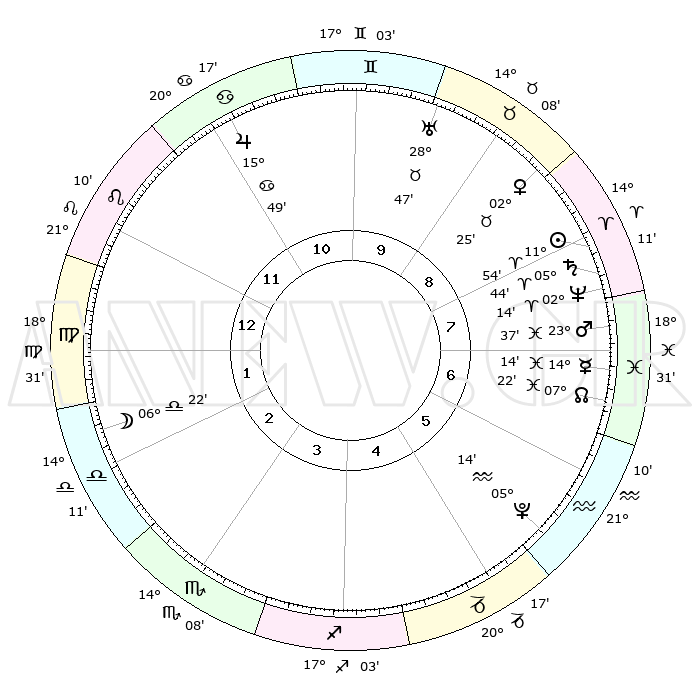 | | ΘΕΣΕΙΣ ΠΛΑΝΗΤΩΝ ΑΣΤΡΟΛΟΓΙΚΟΥ ΧΑΡΤΗ ΤΗΣ ΣΤΙΓΜΗΣ ΑΥΤΗΣ | | | | Πλανήτης | Ζώδιο | Μοίρες | Δεκαήμ. | Σε οίκο | Απόκλιση | | Ακμές των οίκων | | Ηλιος | Κριός | 11°50' | Δεύτερο | 8 | 04 N 41 | | 1ος | 29°13' | Λέων | | Σελήνη | Ζυγός | 05°31' | Πρώτο | 2 | 04 S 21 | | 2ος | 22°59' | Παρθένος | | Ερμής | Ιχθείς | 14°11' | Δεύτερο | 7 | 07 S 30 | | 3ος | 21°35' | Ζυγός | | Αφροδίτη | Ταύρος | 02°20' | Πρώτο | 9 | 11 N 53 | | 4ος | 24°29' | Σκορπιός | | Αρης | Ιχθείς | 23°33' | Τρίτο | 8 | 03 S 31 | | 5ος | 28°44' | Τοξότης | | Δίας | Καρκίνος | 15°49' | Δεύτερο | 11 | 22 N 52 | | 6ος | 00°45' | Υδροχόος | | Κρόνος | Κριός | 05°44' | Πρώτο | 8 | 00 N 19 | | 7ος | 29°13' | Υδροχόος | | Ουρανός | Ταύρος | 28°47' | Τρίτο | 10 | 19 N 43 | | 8ος | 22°59' | Ιχθείς | | Ποσειδώνας | Κριός | 02°14' | Πρώτο | 8 | 00 S 19 | | 9ος | 21°35' | Κριός | | Πλούτωνας | Υδροχόος | 05°14' | Πρώτο | 6 | 22 S 47 | | 10ος | 24°29' | Ταύρος | | Β. Δεσμός | Ιχθείς | 07°22' | Πρώτο | 7 | 08 S 48 | | 11ος | 28°44' | Δίδυμοι | | Ωροσκόπος | Λέων | 29°13' | Τρίτο | | | 12ος | 00°45' | Λέων | | Μεσουράνημα | Ταύρος | 24°29' | Τρίτο | | | |