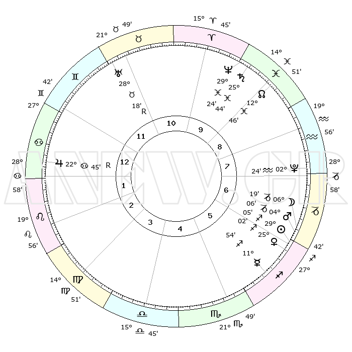 | | ΘΕΣΕΙΣ ΠΛΑΝΗΤΩΝ ΑΣΤΡΟΛΟΓΙΚΟΥ ΧΑΡΤΗ ΤΗΣ ΣΤΙΓΜΗΣ ΑΥΤΗΣ | | | | Πλανήτης | Ζώδιο | Μοίρες | Δεκαήμ. | Σε οίκο | Απόκλιση | | Ακμές των οίκων | | Ηλιος | Τοξότης | 28°60' | Τρίτο | 6 | 23 S 26 | | 1ος | 02°39' | Καρκίνος | | Σελήνη | Αιγόκερως | 05°16' | Πρώτο | 7 | 27 S 55 | | 2ος | 23°18' | Καρκίνος | | Ερμής | Τοξότης | 11°46' | Δεύτερο | 6 | 21 S 23 | | 3ος | 15°17' | Λέων | | Αφροδίτη | Τοξότης | 24°55' | Τρίτο | 6 | 23 S 24 | | 4ος | 12°02' | Παρθένος | | Αρης | Αιγόκερως | 04°02' | Πρώτο | 7 | 24 S 11 | | 5ος | 16°22' | Ζυγός | | Δίας | Καρκίνος | 22°45'R | Τρίτο | 1 | 21 N 43 | | 6ος | 26°09' | Σκορπιός | | Κρόνος | Ιχθείς | 25°44' | Τρίτο | 10 | 03 S 48 | | 7ος | 02°39' | Αιγόκερως | | Ουρανός | Ταύρος | 28°18'R | Τρίτο | 12 | 19 N 35 | | 8ος | 23°18' | Αιγόκερως | | Ποσειδώνας | Ιχθείς | 29°24' | Τρίτο | 10 | 01 S 28 | | 9ος | 15°17' | Υδροχόος | | Πλούτωνας | Υδροχόος | 02°24' | Πρώτο | 8 | 23 S 17 | | 10ος | 12°02' | Ιχθείς | | Β. Δεσμός | Ιχθείς | 12°46' | Δεύτερο | 10 | 06 S 46 | | 11ος | 16°22' | Κριός | | Ωροσκόπος | Καρκίνος | 02°39' | Πρώτο | | | 12ος | 26°09' | Ταύρος | | Μεσουράνημα | Ιχθείς | 12°02' | Δεύτερο | | | |
