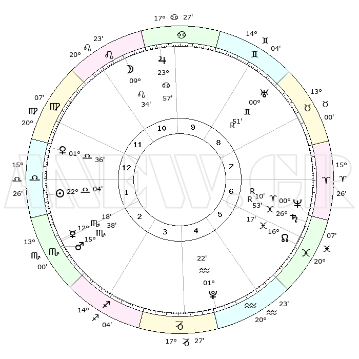 | ΘΕΣΕΙΣ ΠΛΑΝΗΤΩΝ ΑΣΤΡΟΛΟΓΙΚΟΥ ΧΑΡΤΗ ΤΗΣ ΣΤΙΓΜΗΣ ΑΥΤΗΣ | | Πλανήτης | Ζώδιο | Μοίρες | Δεκαήμ. | Σε οίκο | Απόκλιση | | Ακμές των οίκων | Ηλιος | Ζυγός | 21°51' | Τρίτο | 3 | 08 S 31 | | 1ος | 12°37' | Λέων | Σελήνη | Λέων | 06°45' | Πρώτο | 12 | 21 N 55 | | 2ος | 04°41' | Παρθένος | Ερμής | Σκορπιός | 12°00' | Δεύτερο | 4 | 17 S 05 | | 3ος | 01°25' | Ζυγός | Αφροδίτη | Ζυγός | 01°20' | Πρώτο | 2 | 00 N 51 | | 4ος | 03°41' | Σκορπιός | Αρης | Σκορπιός | 15°29' | Δεύτερο | 4 | 16 S 41 | | 5ος | 09°07' | Τοξότης | Δίας | Καρκίνος | 23°55' | Τρίτο | 12 | 21 N 22 | | 6ος | 12°55' | Αιγόκερως | Κρόνος | Ιχθείς | 26°53'R | Τρίτο | 8 | 03 S 32 | | 7ος | 12°37' | Υδροχόος | Ουρανός | Δίδυμοι | 00°51'R | Πρώτο | 10 | 20 N 07 | | 8ος | 04°41' | Ιχθείς | Ποσειδώνας | Κριός | 00°11'R | Πρώτο | 8 | 01 S 11 | | 9ος | 01°25' | Κριός | Πλούτωνας | Υδροχόος | 01°22' | Πρώτο | 6 | 23 S 32 | | 10ος | 03°41' | Ταύρος | Β. Δεσμός | Ιχθείς | 16°18' | Δεύτερο | 8 | 05 S 24 | | 11ος | 09°07' | Δίδυμοι | Ωροσκόπος | Λέων | 12°37' | Δεύτερο | | | 12ος | 12°55' | Καρκίνος | Μεσουράνημα | Ταύρος | 03°41' | Πρώτο | | | |
