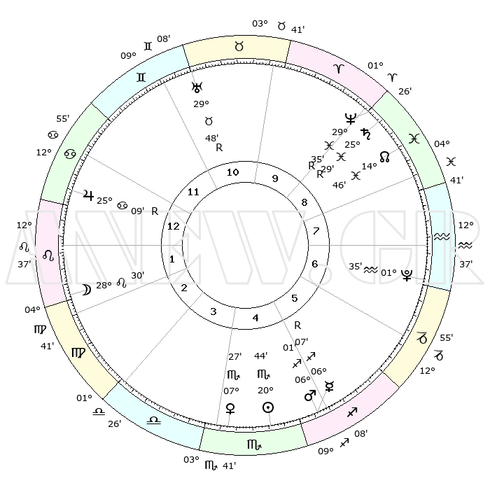 | | ΘΕΣΕΙΣ ΠΛΑΝΗΤΩΝ ΑΣΤΡΟΛΟΓΙΚΟΥ ΧΑΡΤΗ ΤΗΣ ΣΤΙΓΜΗΣ ΑΥΤΗΣ | | | | Πλανήτης | Ζώδιο | Μοίρες | Δεκαήμ. | Σε οίκο | Απόκλιση | | Ακμές των οίκων | | Ηλιος | Σκορπιός | 20°40' | Τρίτο | 5 | 17 S 55 | | 1ος | 24°11' | Καρκίνος | | Σελήνη | Λέων | 27°42' | Τρίτο | 2 | 13 N 47 | | 2ος | 14°53' | Λέων | | Ερμής | Τοξότης | 06°09'R | Πρώτο | 5 | 23 S 05 | | 3ος | 09°09' | Παρθένος | | Αφροδίτη | Σκορπιός | 07°22' | Πρώτο | 4 | 12 S 46 | | 4ος | 09°24' | Ζυγός | | Αρης | Τοξότης | 05°58' | Πρώτο | 5 | 21 S 48 | | 5ος | 15°30' | Σκορπιός | | Δίας | Καρκίνος | 25°09'R | Τρίτο | 1 | 21 N 13 | | 6ος | 22°11' | Τοξότης | | Κρόνος | Ιχθείς | 25°30'R | Τρίτο | 9 | 04 S 01 | | 7ος | 24°11' | Αιγόκερως | | Ουρανός | Ταύρος | 29°48'R | Τρίτο | 11 | 19 N 54 | | 8ος | 14°53' | Υδροχόος | | Ποσειδώνας | Ιχθείς | 29°35'R | Τρίτο | 9 | 01 S 25 | | 9ος | 09°09' | Ιχθείς | | Πλούτωνας | Υδροχόος | 01°35' | Πρώτο | 7 | 23 S 29 | | 10ος | 09°24' | Κριός | | Β. Δεσμός | Ιχθείς | 14°46' | Δεύτερο | 9 | 06 S 00 | | 11ος | 15°30' | Ταύρος | | Ωροσκόπος | Καρκίνος | 24°11' | Τρίτο | | | 12ος | 22°11' | Δίδυμοι | | Μεσουράνημα | Κριός | 09°24' | Πρώτο | | | |
