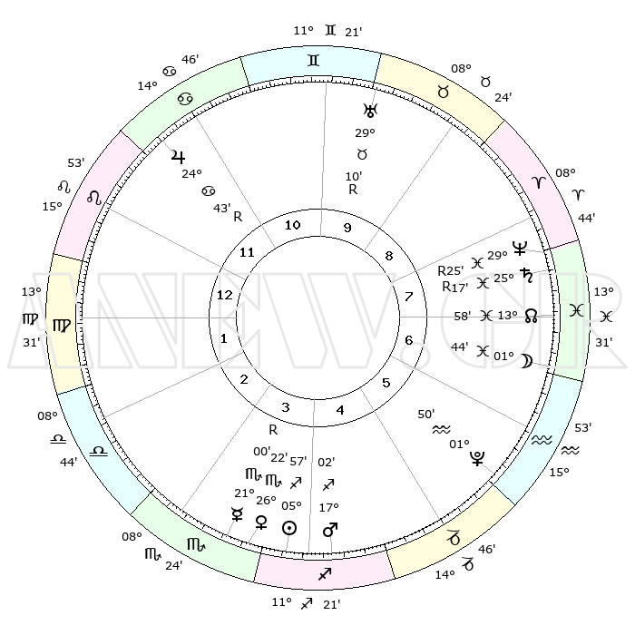 | | ΘΕΣΕΙΣ ΠΛΑΝΗΤΩΝ ΑΣΤΡΟΛΟΓΙΚΟΥ ΧΑΡΤΗ ΤΗΣ ΣΤΙΓΜΗΣ ΑΥΤΗΣ | | | | Πλανήτης | Ζώδιο | Μοίρες | Δεκαήμ. | Σε οίκο | Απόκλιση | | Ακμές των οίκων | | Ηλιος | Τοξότης | 05°55' | Πρώτο | 4 | 21 S 17 | | 1ος | 06°36' | Παρθένος | | Σελήνη | Ιχθείς | 01°25' | Πρώτο | 6 | 12 S 02 | | 2ος | 01°08' | Ζυγός | | Ερμής | Σκορπιός | 21°01'R | Τρίτο | 3 | 15 S 42 | | 3ος | 00°21' | Σκορπιός | | Αφροδίτη | Σκορπιός | 26°20' | Τρίτο | 3 | 18 S 32 | | 4ος | 03°19' | Τοξότης | | Αρης | Τοξότης | 17°01' | Δεύτερο | 4 | 23 S 26 | | 5ος | 07°05' | Αιγόκερως | | Δίας | Καρκίνος | 24°43'R | Τρίτο | 11 | 21 N 20 | | 6ος | 08°34' | Υδροχόος | | Κρόνος | Ιχθείς | 25°17'R | Τρίτο | 7 | 04 S 04 | | 7ος | 06°36' | Ιχθείς | | Ουρανός | Ταύρος | 29°10'R | Τρίτο | 9 | 19 N 46 | | 8ος | 01°08' | Κριός | | Ποσειδώνας | Ιχθείς | 29°25'R | Τρίτο | 7 | 01 S 29 | | 9ος | 00°21' | Ταύρος | | Πλούτωνας | Υδροχόος | 01°50' | Πρώτο | 5 | 23 S 25 | | 10ος | 03°19' | Δίδυμοι | | Β. Δεσμός | Ιχθείς | 13°58' | Δεύτερο | 7 | 06 S 18 | | 11ος | 07°05' | Καρκίνος | | Ωροσκόπος | Παρθένος | 06°36' | Πρώτο | | | 12ος | 08°34' | Λέων | | Μεσουράνημα | Δίδυμοι | 03°19' | Πρώτο | | | |