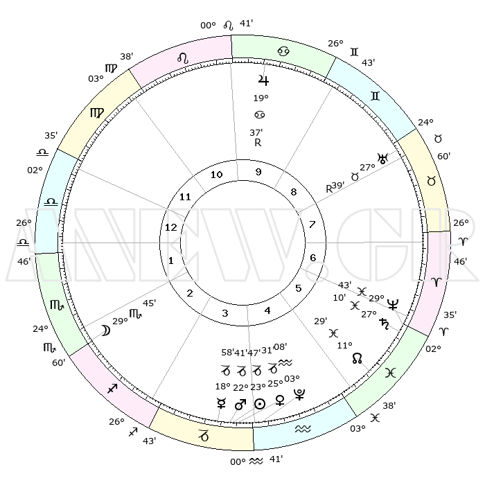 | | ΘΕΣΕΙΣ ΠΛΑΝΗΤΩΝ ΑΣΤΡΟΛΟΓΙΚΟΥ ΧΑΡΤΗ ΤΗΣ ΣΤΙΓΜΗΣ ΑΥΤΗΣ | | | | Πλανήτης | Ζώδιο | Μοίρες | Δεκαήμ. | Σε οίκο | Απόκλιση | | Ακμές των οίκων | | Ηλιος | Αιγόκερως | 23°25' | Τρίτο | 7 | 21 S 24 | | 1ος | 14°45' | Καρκίνος | | Σελήνη | Σκορπιός | 25°37' | Τρίτο | 5 | 23 S 58 | | 2ος | 05°11' | Λέων | | Ερμής | Αιγόκερως | 18°24' | Δεύτερο | 7 | 23 S 51 | | 3ος | 28°18' | Λέων | | Αφροδίτη | Αιγόκερως | 25°05' | Τρίτο | 7 | 22 S 02 | | 4ος | 27°04' | Παρθένος | | Αρης | Αιγόκερως | 22°25' | Τρίτο | 7 | 22 S 31 | | 5ος | 02°46' | Σκορπιός | | Δίας | Καρκίνος | 19°40'R | Δεύτερο | 1 | 22 N 15 | | 6ος | 11°00' | Τοξότης | | Κρόνος | Ιχθείς | 27°08' | Τρίτο | 10 | 03 S 11 | | 7ος | 14°45' | Αιγόκερως | | Ουρανός | Ταύρος | 27°39'R | Τρίτο | 11 | 19 N 27 | | 8ος | 05°11' | Υδροχόος | | Ποσειδώνας | Ιχθείς | 29°43' | Τρίτο | 10 | 01 S 20 | | 9ος | 28°18' | Υδροχόος | | Πλούτωνας | Υδροχόος | 03°07' | Πρώτο | 7 | 23 S 08 | | 10ος | 27°04' | Ιχθείς | | Β. Δεσμός | Ιχθείς | 11°30' | Δεύτερο | 9 | 07 S 15 | | 11ος | 02°46' | Ταύρος | | Ωροσκόπος | Καρκίνος | 14°45' | Δεύτερο | | | 12ος | 11°00' | Δίδυμοι | | Μεσουράνημα | Ιχθείς | 27°04' | Τρίτο | | | |