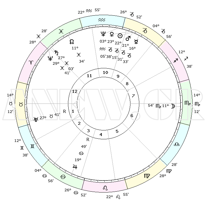 | | ΘΕΣΕΙΣ ΠΛΑΝΗΤΩΝ ΑΣΤΡΟΛΟΓΙΚΟΥ ΧΑΡΤΗ ΤΗΣ ΣΤΙΓΜΗΣ ΑΥΤΗΣ | | | | Πλανήτης | Ζώδιο | Μοίρες | Δεκαήμ. | Σε οίκο | Απόκλιση | | Ακμές των οίκων | | Ηλιος | Αιγόκερως | 22°10' | Τρίτο | 10 | 21 S 37 | | 1ος | 04°38' | Κριός | | Σελήνη | Σκορπιός | 11°02' | Δεύτερο | 7 | 19 S 23 | | 2ος | 13°47' | Ταύρος | | Ερμής | Αιγόκερως | 16°26' | Δεύτερο | 10 | 24 S 02 | | 3ος | 10°29' | Δίδυμοι | | Αφροδίτη | Αιγόκερως | 23°32' | Τρίτο | 10 | 22 S 16 | | 4ος | 02°36' | Καρκίνος | | Αρης | Αιγόκερως | 21°28' | Τρίτο | 10 | 22 S 40 | | 5ος | 25°08' | Καρκίνος | | Δίας | Καρκίνος | 19°50'R | Δεύτερο | 4 | 22 N 14 | | 6ος | 23°16' | Λέων | | Κρόνος | Ιχθείς | 27°03' | Τρίτο | 12 | 03 S 13 | | 7ος | 04°38' | Ζυγός | | Ουρανός | Ταύρος | 27°41'R | Τρίτο | 2 | 19 N 27 | | 8ος | 13°47' | Σκορπιός | | Ποσειδώνας | Ιχθείς | 29°41' | Τρίτο | 12 | 01 S 20 | | 9ος | 10°29' | Τοξότης | | Πλούτωνας | Υδροχόος | 03°04' | Πρώτο | 11 | 23 S 09 | | 10ος | 02°36' | Αιγόκερως | | Β. Δεσμός | Ιχθείς | 11°34' | Δεύτερο | 12 | 07 S 13 | | 11ος | 25°08' | Αιγόκερως | | Ωροσκόπος | Κριός | 04°38' | Πρώτο | | | 12ος | 23°16' | Υδροχόος | | Μεσουράνημα | Αιγόκερως | 02°36' | Πρώτο | | | |