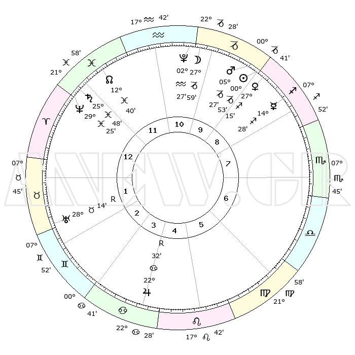 | | ΘΕΣΕΙΣ ΠΛΑΝΗΤΩΝ ΑΣΤΡΟΛΟΓΙΚΟΥ ΧΑΡΤΗ ΤΗΣ ΣΤΙΓΜΗΣ ΑΥΤΗΣ | | | | Πλανήτης | Ζώδιο | Μοίρες | Δεκαήμ. | Σε οίκο | Απόκλιση | | Ακμές των οίκων | | Ηλιος | Αιγόκερως | 00°49' | Πρώτο | 10 | 23 S 26 | | 1ος | 25°48' | Ιχθείς | | Σελήνη | Αιγόκερως | 27°04' | Τρίτο | 11 | 24 S 12 | | 2ος | 07°05' | Ταύρος | | Ερμής | Τοξότης | 14°21' | Δεύτερο | 9 | 21 S 56 | | 3ος | 05°08' | Δίδυμοι | | Αφροδίτη | Τοξότης | 27°10' | Τρίτο | 9 | 23 S 32 | | 4ος | 27°39' | Δίδυμοι | | Αρης | Αιγόκερως | 05°23' | Πρώτο | 10 | 24 S 09 | | 5ος | 19°47' | Καρκίνος | | Δίας | Καρκίνος | 22°33'R | Τρίτο | 5 | 21 N 46 | | 6ος | 16°33' | Λέων | | Κρόνος | Ιχθείς | 25°48' | Τρίτο | 12 | 03 S 46 | | 7ος | 25°48' | Παρθένος | | Ουρανός | Ταύρος | 28°14'R | Τρίτο | 2 | 19 N 34 | | 8ος | 07°05' | Σκορπιός | | Ποσειδώνας | Ιχθείς | 29°25' | Τρίτο | 1 | 01 S 28 | | 9ος | 05°08' | Τοξότης | | Πλούτωνας | Υδροχόος | 02°27' | Πρώτο | 11 | 23 S 17 | | 10ος | 27°39' | Τοξότης | | Β. Δεσμός | Ιχθείς | 12°41' | Δεύτερο | 12 | 06 S 48 | | 11ος | 19°47' | Αιγόκερως | | Ωροσκόπος | Ιχθείς | 25°48' | Τρίτο | | | 12ος | 16°33' | Υδροχόος | | Μεσουράνημα | Τοξότης | 27°39' | Τρίτο | | | |
