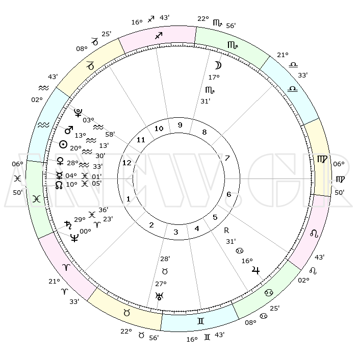 | | ΘΕΣΕΙΣ ΠΛΑΝΗΤΩΝ ΑΣΤΡΟΛΟΓΙΚΟΥ ΧΑΡΤΗ ΤΗΣ ΣΤΙΓΜΗΣ ΑΥΤΗΣ | | | | Πλανήτης | Ζώδιο | Μοίρες | Δεκαήμ. | Σε οίκο | Απόκλιση | | Ακμές των οίκων | | Ηλιος | Υδροχόος | 20°27' | Τρίτο | 1 | 14 S 40 | | 1ος | 08°29' | Υδροχόος | | Σελήνη | Σκορπιός | 16°52' | Δεύτερο | 9 | 21 S 32 | | 2ος | 23°43' | Ιχθείς | | Ερμής | Ιχθείς | 03°56' | Πρώτο | 1 | 11 S 02 | | 3ος | 00°41' | Ταύρος | | Αφροδίτη | Υδροχόος | 28°28' | Τρίτο | 1 | 13 S 22 | | 4ος | 27°46' | Ταύρος | | Αρης | Υδροχόος | 13°10' | Δεύτερο | 1 | 17 S 53 | | 5ος | 20°01' | Δίδυμοι | | Δίας | Καρκίνος | 16°31'R | Δεύτερο | 6 | 22 N 44 | | 6ος | 11°50' | Καρκίνος | | Κρόνος | Ιχθείς | 29°36' | Τρίτο | 2 | 02 S 08 | | 7ος | 08°29' | Λέων | | Ουρανός | Ταύρος | 27°28' | Τρίτο | 3 | 19 N 24 | | 8ος | 23°43' | Παρθένος | | Ποσειδώνας | Κριός | 00°23' | Πρώτο | 2 | 01 S 03 | | 9ος | 00°41' | Σκορπιός | | Πλούτωνας | Υδροχόος | 03°57' | Πρώτο | 12 | 22 S 58 | | 10ος | 27°47' | Σκορπιός | | Β. Δεσμός | Ιχθείς | 10°06' | Δεύτερο | 1 | 07 S 47 | | 11ος | 20°01' | Τοξότης | | Ωροσκόπος | Υδροχόος | 08°29' | Πρώτο | | | 12ος | 11°50' | Αιγόκερως | | Μεσουράνημα | Σκορπιός | 27°47' | Τρίτο | | | |