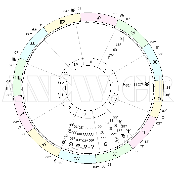 | | ΘΕΣΕΙΣ ΠΛΑΝΗΤΩΝ ΑΣΤΡΟΛΟΓΙΚΟΥ ΧΑΡΤΗ ΤΗΣ ΣΤΙΓΜΗΣ ΑΥΤΗΣ | | | | Πλανήτης | Ζώδιο | Μοίρες | Δεκαήμ. | Σε οίκο | Απόκλιση | | Ακμές των οίκων | | Ηλιος | Υδροχόος | 02°57' | Πρώτο | 3 | 19 S 30 | | 1ος | 04°08' | Σκορπιός | | Σελήνη | Ιχθείς | 22°01' | Τρίτο | 5 | 02 S 07 | | 2ος | 02°48' | Τοξότης | | Ερμής | Υδροχόος | 03°49' | Πρώτο | 3 | 21 S 19 | | 3ος | 05°06' | Αιγόκερως | | Αφροδίτη | Υδροχόος | 06°50' | Πρώτο | 3 | 19 S 43 | | 4ος | 09°35' | Υδροχόος | | Αρης | Αιγόκερως | 29°41' | Τρίτο | 3 | 21 S 12 | | 5ος | 12°26' | Ιχθείς | | Δίας | Καρκίνος | 18°26'R | Δεύτερο | 9 | 22 N 27 | | 6ος | 10°42' | Κριός | | Κρόνος | Ιχθείς | 27°55' | Τρίτο | 5 | 02 S 51 | | 7ος | 04°08' | Ταύρος | | Ουρανός | Ταύρος | 27°31'R | Τρίτο | 7 | 19 N 25 | | 8ος | 02°48' | Δίδυμοι | | Ποσειδώνας | Ιχθείς | 29°55' | Τρίτο | 5 | 01 S 15 | | 9ος | 05°06' | Καρκίνος | | Πλούτωνας | Υδροχόος | 03°25' | Πρώτο | 3 | 23 S 05 | | 10ος | 09°35' | Λέων | | Β. Δεσμός | Ιχθείς | 11°00' | Δεύτερο | 4 | 07 S 26 | | 11ος | 12°26' | Παρθένος | | Ωροσκόπος | Σκορπιός | 04°08' | Πρώτο | | | 12ος | 10°42' | Ζυγός | | Μεσουράνημα | Λέων | 09°35' | Πρώτο | | | |