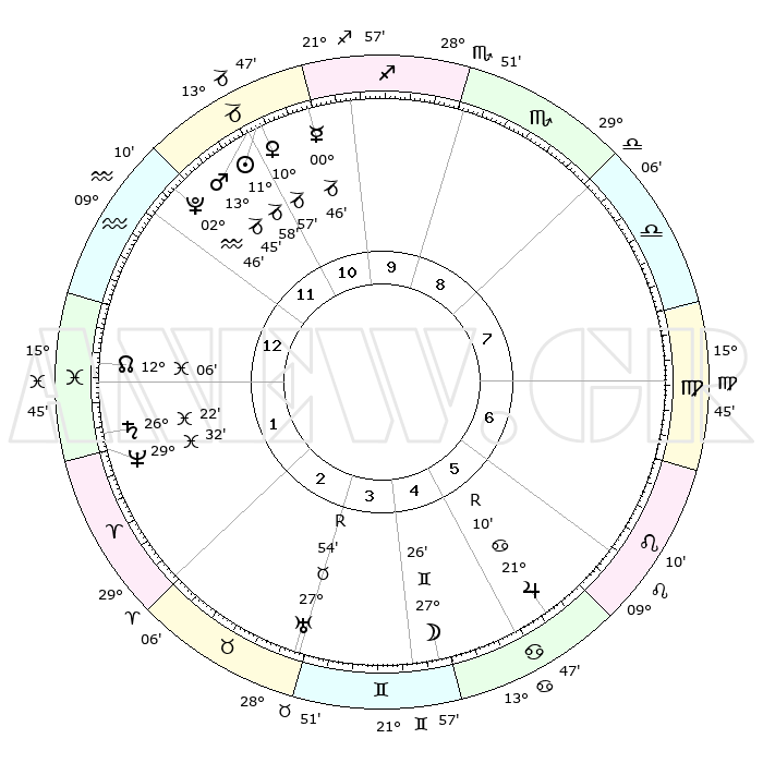 | | ΘΕΣΕΙΣ ΠΛΑΝΗΤΩΝ ΑΣΤΡΟΛΟΓΙΚΟΥ ΧΑΡΤΗ ΤΗΣ ΣΤΙΓΜΗΣ ΑΥΤΗΣ | | | | Πλανήτης | Ζώδιο | Μοίρες | Δεκαήμ. | Σε οίκο | Απόκλιση | | Ακμές των οίκων | | Ηλιος | Αιγόκερως | 11°54' | Δεύτερο | 11 | 22 S 54 | | 1ος | 10°36' | Υδροχόος | | Σελήνη | Δίδυμοι | 26°26' | Τρίτο | 5 | 28 N 16 | | 2ος | 26°01' | Ιχθείς | | Ερμής | Αιγόκερως | 00°40' | Πρώτο | 11 | 24 S 09 | | 3ος | 02°36' | Ταύρος | | Αφροδίτη | Αιγόκερως | 10°52' | Δεύτερο | 11 | 23 S 32 | | 4ος | 29°22' | Ταύρος | | Αρης | Αιγόκερως | 13°42' | Δεύτερο | 12 | 23 S 37 | | 5ος | 21°30' | Δίδυμοι | | Δίας | Καρκίνος | 21°11'R | Τρίτο | 6 | 22 N 00 | | 6ος | 13°27' | Καρκίνος | | Κρόνος | Ιχθείς | 26°22' | Τρίτο | 2 | 03 S 31 | | 7ος | 10°36' | Λέων | | Ουρανός | Ταύρος | 27°55'R | Τρίτο | 3 | 19 N 30 | | 8ος | 26°02' | Παρθένος | | Ποσειδώνας | Ιχθείς | 29°31' | Τρίτο | 2 | 01 S 25 | | 9ος | 02°36' | Σκορπιός | | Πλούτωνας | Υδροχόος | 02°46' | Πρώτο | 12 | 23 S 13 | | 10ος | 29°22' | Σκορπιός | | Β. Δεσμός | Ιχθείς | 12°06' | Δεύτερο | 1 | 07 S 01 | | 11ος | 21°30' | Τοξότης | | Ωροσκόπος | Υδροχόος | 10°36' | Δεύτερο | | | 12ος | 13°27' | Αιγόκερως | | Μεσουράνημα | Σκορπιός | 29°22' | Τρίτο | | | |