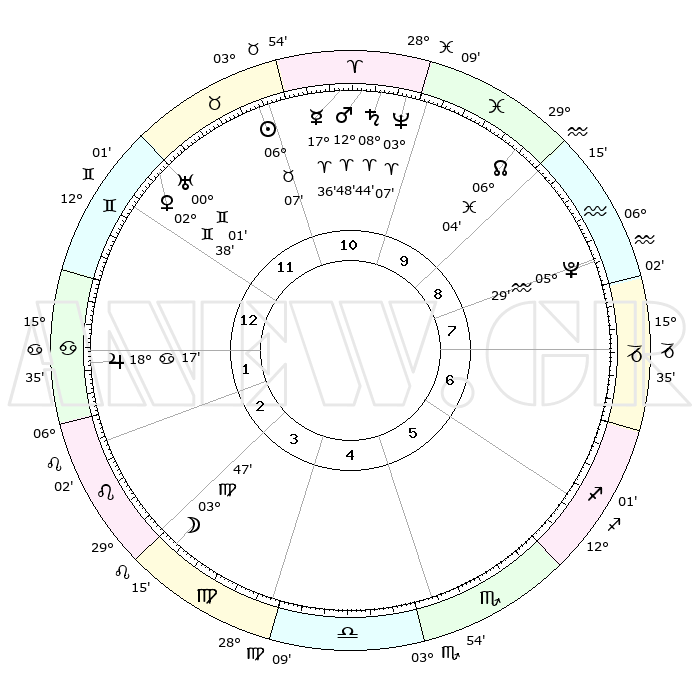| | ΘΕΣΕΙΣ ΠΛΑΝΗΤΩΝ ΑΣΤΡΟΛΟΓΙΚΟΥ ΧΑΡΤΗ ΤΗΣ ΣΤΙΓΜΗΣ ΑΥΤΗΣ | | | | Πλανήτης | Ζώδιο | Μοίρες | Δεκαήμ. | Σε οίκο | Απόκλιση | | Ακμές των οίκων | | Ηλιος | Ταύρος | 06°03' | Πρώτο | 11 | 13 N 32 | | 1ος | 26°30' | Δίδυμοι | | Σελήνη | Παρθένος | 03°00' | Πρώτο | 3 | 10 N 45 | | 2ος | 17°32' | Καρκίνος | | Ερμής | Κριός | 17°29' | Δεύτερο | 11 | 04 N 41 | | 3ος | 09°08' | Λέων | | Αφροδίτη | Δίδυμοι | 02°34' | Πρώτο | 12 | 21 N 21 | | 4ος | 04°54' | Παρθένος | | Αρης | Κριός | 12°45' | Δεύτερο | 11 | 04 N 11 | | 5ος | 08°15' | Ζυγός | | Δίας | Καρκίνος | 18°17' | Δεύτερο | 2 | 22 N 34 | | 6ος | 18°27' | Σκορπιός | | Κρόνος | Κριός | 08°43' | Πρώτο | 11 | 01 N 28 | | 7ος | 26°30' | Τοξότης | | Ουρανός | Δίδυμοι | 00°01' | Πρώτο | 12 | 19 N 59 | | 8ος | 17°32' | Αιγόκερως | | Ποσειδώνας | Κριός | 03°07' | Πρώτο | 10 | 00 N 02 | | 9ος | 09°08' | Υδροχόος | | Πλούτωνας | Υδροχόος | 05°29' | Πρώτο | 8 | 22 S 48 | | 10ος | 04°54' | Ιχθείς | | Β. Δεσμός | Ιχθείς | 06°04' | Πρώτο | 10 | 09 S 17 | | 11ος | 08°15' | Κριός | | Ωροσκόπος | Δίδυμοι | 26°30' | Τρίτο | | | 12ος | 18°27' | Ταύρος | | Μεσουράνημα | Ιχθείς | 04°54' | Πρώτο | | | |