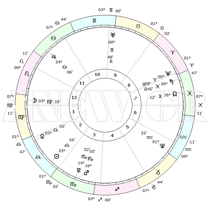 | ΘΕΣΕΙΣ ΠΛΑΝΗΤΩΝ ΑΣΤΡΟΛΟΓΙΚΟΥ ΧΑΡΤΗ ΤΗΣ ΣΤΙΓΜΗΣ ΑΥΤΗΣ | | Πλανήτης | Ζώδιο | Μοίρες | Δεκαήμ. | Σε οίκο | Απόκλιση | | Ακμές των οίκων | Ηλιος | Ζυγός | 23°30' | Τρίτο | 7 | 09 S 07 | | 1ος | 00°33' | Κριός | Σελήνη | Λέων | 28°14' | Τρίτο | 6 | 13 N 44 | | 2ος | 10°42' | Ταύρος | Ερμής | Σκορπιός | 14°18' | Δεύτερο | 8 | 17 S 56 | | 3ος | 08°01' | Δίδυμοι | Αφροδίτη | Ζυγός | 03°24' | Πρώτο | 7 | 00 N 03 | | 4ος | 00°18' | Καρκίνος | Αρης | Σκορπιός | 16°38' | Δεύτερο | 8 | 17 S 02 | | 5ος | 22°38' | Καρκίνος | Δίας | Καρκίνος | 24°04' | Τρίτο | 5 | 21 N 21 | | 6ος | 20°07' | Λέων | Κρόνος | Ιχθείς | 26°47'R | Τρίτο | 12 | 03 S 34 | | 7ος | 00°33' | Ζυγός | Ουρανός | Δίδυμοι | 00°48'R | Πρώτο | 2 | 20 N 06 | | 8ος | 10°42' | Σκορπιός | Ποσειδώνας | Κριός | 00°08'R | Πρώτο | 12 | 01 S 12 | | 9ος | 08°01' | Τοξότης | Πλούτωνας | Υδροχόος | 01°22' | Πρώτο | 11 | 23 S 32 | | 10ος | 00°18' | Αιγόκερως | Β. Δεσμός | Ιχθείς | 16°13' | Δεύτερο | 12 | 05 S 26 | | 11ος | 22°38' | Αιγόκερως | Ωροσκόπος | Κριός | 00°33' | Πρώτο | | | 12ος | 20°07' | Υδροχόος | Μεσουράνημα | Αιγόκερως | 00°18' | Πρώτο | | | |