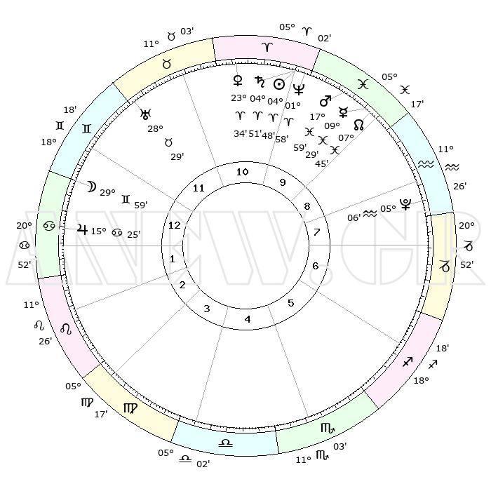 | | ΘΕΣΕΙΣ ΠΛΑΝΗΤΩΝ ΑΣΤΡΟΛΟΓΙΚΟΥ ΧΑΡΤΗ ΤΗΣ ΣΤΙΓΜΗΣ ΑΥΤΗΣ | | | | Πλανήτης | Ζώδιο | Μοίρες | Δεκαήμ. | Σε οίκο | Απόκλιση | | Ακμές των οίκων | | Ηλιος | Κριός | 04°44' | Πρώτο | 10 | 01 N 53 | | 1ος | 00°43' | Καρκίνος | | Σελήνη | Δίδυμοι | 29°04' | Τρίτο | 12 | 28 N 20 | | 2ος | 21°28' | Καρκίνος | | Ερμής | Ιχθείς | 09°27' | Πρώτο | 9 | 08 S 05 | | 3ος | 13°19' | Λέων | | Αφροδίτη | Κριός | 23°29' | Τρίτο | 11 | 08 N 28 | | 4ος | 09°45' | Παρθένος | | Αρης | Ιχθείς | 17°56' | Δεύτερο | 10 | 05 S 45 | | 5ος | 13°48' | Ζυγός | | Δίας | Καρκίνος | 15°25' | Δεύτερο | 1 | 22 N 54 | | 6ος | 23°45' | Σκορπιός | | Κρόνος | Κριός | 04°50' | Πρώτο | 10 | 00 S 02 | | 7ος | 00°43' | Αιγόκερως | | Ουρανός | Ταύρος | 28°29' | Τρίτο | 12 | 19 N 39 | | 8ος | 21°28' | Αιγόκερως | | Ποσειδώνας | Κριός | 01°58' | Πρώτο | 10 | 00 S 25 | | 9ος | 13°19' | Υδροχόος | | Πλούτωνας | Υδροχόος | 05°06' | Πρώτο | 8 | 22 S 48 | | 10ος | 09°45' | Ιχθείς | | Β. Δεσμός | Ιχθείς | 07°45' | Πρώτο | 9 | 08 S 40 | | 11ος | 13°48' | Κριός | | Ωροσκόπος | Καρκίνος | 00°43' | Πρώτο | | | 12ος | 23°45' | Ταύρος | | Μεσουράνημα | Ιχθείς | 09°45' | Πρώτο | | | |