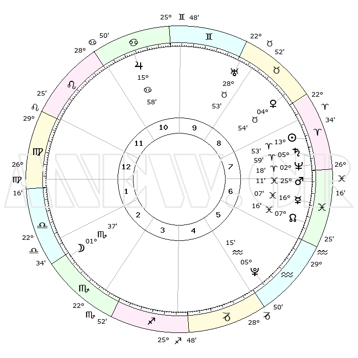 | | ΘΕΣΕΙΣ ΠΛΑΝΗΤΩΝ ΑΣΤΡΟΛΟΓΙΚΟΥ ΧΑΡΤΗ ΤΗΣ ΣΤΙΓΜΗΣ ΑΥΤΗΣ | | | | Πλανήτης | Ζώδιο | Μοίρες | Δεκαήμ. | Σε οίκο | Απόκλιση | | Ακμές των οίκων | | Ηλιος | Κριός | 13°49' | Δεύτερο | 8 | 05 N 27 | | 1ος | 07°17' | Παρθένος | | Σελήνη | Σκορπιός | 00°49' | Πρώτο | 2 | 15 S 35 | | 2ος | 01°53' | Ζυγός | | Ερμής | Ιχθείς | 16°03' | Δεύτερο | 7 | 07 S 03 | | 3ος | 01°09' | Σκορπιός | | Αφροδίτη | Ταύρος | 04°49' | Πρώτο | 9 | 12 N 48 | | 4ος | 04°06' | Τοξότης | | Αρης | Ιχθείς | 25°08' | Τρίτο | 7 | 02 S 53 | | 5ος | 07°51' | Αιγόκερως | | Δίας | Καρκίνος | 15°57' | Δεύτερο | 11 | 22 N 51 | | 6ος | 09°18' | Υδροχόος | | Κρόνος | Κριός | 05°59' | Πρώτο | 8 | 00 N 25 | | 7ος | 07°17' | Ιχθείς | | Ουρανός | Ταύρος | 28°53' | Τρίτο | 9 | 19 N 44 | | 8ος | 01°53' | Κριός | | Ποσειδώνας | Κριός | 02°18' | Πρώτο | 8 | 00 S 17 | | 9ος | 01°09' | Ταύρος | | Πλούτωνας | Υδροχόος | 05°15' | Πρώτο | 5 | 22 S 47 | | 10ος | 04°06' | Δίδυμοι | | Β. Δεσμός | Ιχθείς | 07°16' | Πρώτο | 6 | 08 S 50 | | 11ος | 07°51' | Καρκίνος | | Ωροσκόπος | Παρθένος | 07°17' | Πρώτο | | | 12ος | 09°18' | Λέων | | Μεσουράνημα | Δίδυμοι | 04°06' | Πρώτο | | | |