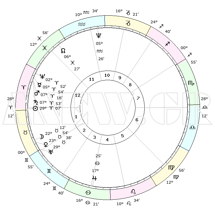 | | ΘΕΣΕΙΣ ΠΛΑΝΗΤΩΝ ΑΣΤΡΟΛΟΓΙΚΟΥ ΧΑΡΤΗ ΤΗΣ ΣΤΙΓΜΗΣ ΑΥΤΗΣ | | | | Πλανήτης | Ζώδιο | Μοίρες | Δεκαήμ. | Σε οίκο | Απόκλιση | | Ακμές των οίκων | | Ηλιος | Κριός | 29°03' | Τρίτο | 2 | 11 N 08 | | 1ος | 14°50' | Ιχθείς | | Σελήνη | Ταύρος | 21°05' | Τρίτο | 2 | 22 N 44 | | 2ος | 28°20' | Κριός | | Ερμής | Κριός | 05°47' | Πρώτο | 1 | 00 S 07 | | 3ος | 28°15' | Ταύρος | | Αφροδίτη | Ταύρος | 23°49' | Τρίτο | 2 | 19 N 04 | | 4ος | 21°25' | Δίδυμοι | | Αρης | Κριός | 07°12' | Πρώτο | 1 | 01 N 59 | | 5ος | 13°14' | Καρκίνος | | Δίας | Καρκίνος | 17°24' | Δεύτερο | 5 | 22 N 41 | | 6ος | 08°30' | Λέων | | Κρόνος | Κριός | 07°53' | Πρώτο | 1 | 01 N 09 | | 7ος | 14°50' | Παρθένος | | Ουρανός | Ταύρος | 29°38' | Τρίτο | 3 | 19 N 54 | | 8ος | 28°20' | Ζυγός | | Ποσειδώνας | Κριός | 02°52' | Πρώτο | 1 | 00 S 04 | | 9ος | 28°15' | Σκορπιός | | Πλούτωνας | Υδροχόος | 05°26' | Πρώτο | 11 | 22 S 47 | | 10ος | 21°25' | Τοξότης | | Β. Δεσμός | Ιχθείς | 06°27' | Πρώτο | 12 | 09 S 09 | | 11ος | 13°14' | Αιγόκερως | | Ωροσκόπος | Ιχθείς | 14°50' | Δεύτερο | | | 12ος | 08°30' | Υδροχόος | | Μεσουράνημα | Τοξότης | 21°25' | Τρίτο | | | |