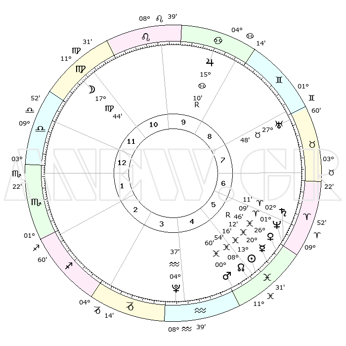 | | ΘΕΣΕΙΣ ΠΛΑΝΗΤΩΝ ΑΣΤΡΟΛΟΓΙΚΟΥ ΧΑΡΤΗ ΤΗΣ ΣΤΙΓΜΗΣ ΑΥΤΗΣ | | | | Πλανήτης | Ζώδιο | Μοίρες | Δεκαήμ. | Σε οίκο | Απόκλιση | | Ακμές των οίκων | | Ηλιος | Ιχθείς | 13°12' | Δεύτερο | 5 | 06 S 36 | | 1ος | 14°55' | Ζυγός | | Σελήνη | Παρθένος | 16°54' | Δεύτερο | 11 | 04 N 30 | | 2ος | 12°28' | Σκορπιός | | Ερμής | Ιχθείς | 20°15'R | Τρίτο | 6 | 00 S 32 | | 3ος | 13°30' | Τοξότης | | Αφροδίτη | Ιχθείς | 26°42' | Τρίτο | 6 | 02 S 31 | | 4ος | 16°51' | Αιγόκερως | | Αρης | Ιχθείς | 00°57' | Πρώτο | 5 | 12 S 09 | | 5ος | 19°48' | Υδροχόος | | Δίας | Καρκίνος | 15°10'R | Δεύτερο | 9 | 22 N 55 | | 6ος | 19°33' | Ιχθείς | | Κρόνος | Κριός | 02°10' | Πρώτο | 6 | 01 S 05 | | 7ος | 14°55' | Κριός | | Ουρανός | Ταύρος | 27°48' | Τρίτο | 8 | 19 N 29 | | 8ος | 12°28' | Ταύρος | | Ποσειδώνας | Κριός | 01°09' | Πρώτο | 6 | 00 S 45 | | 9ος | 13°30' | Δίδυμοι | | Πλούτωνας | Υδροχόος | 04°37' | Πρώτο | 4 | 22 S 52 | | 10ος | 16°51' | Καρκίνος | | Β. Δεσμός | Ιχθείς | 08°54' | Πρώτο | 5 | 08 S 14 | | 11ος | 19°48' | Λέων | | Ωροσκόπος | Ζυγός | 14°55' | Δεύτερο | | | 12ος | 19°33' | Παρθένος | | Μεσουράνημα | Καρκίνος | 16°51' | Δεύτερο | | | |