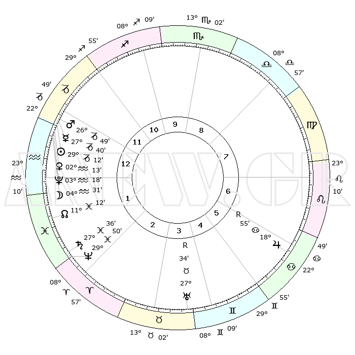 | | ΘΕΣΕΙΣ ΠΛΑΝΗΤΩΝ ΑΣΤΡΟΛΟΓΙΚΟΥ ΧΑΡΤΗ ΤΗΣ ΣΤΙΓΜΗΣ ΑΥΤΗΣ | | | | Πλανήτης | Ζώδιο | Μοίρες | Δεκαήμ. | Σε οίκο | Απόκλιση | | Ακμές των οίκων | | Ηλιος | Αιγόκερως | 29°09' | Τρίτο | 1 | 20 S 19 | | 1ος | 25°41' | Αιγόκερως | | Σελήνη | Υδροχόος | 03°46' | Πρώτο | 1 | 22 S 14 | | 2ος | 09°00' | Ιχθείς | | Ερμής | Αιγόκερως | 27°34' | Τρίτο | 1 | 22 S 35 | | 3ος | 18°04' | Κριός | | Αφροδίτη | Υδροχόος | 02°09' | Πρώτο | 1 | 20 S 45 | | 4ος | 17°18' | Ταύρος | | Αρης | Αιγόκερως | 26°46' | Τρίτο | 1 | 21 S 46 | | 5ος | 10°25' | Δίδυμοι | | Δίας | Καρκίνος | 18°55'R | Δεύτερο | 6 | 22 N 23 | | 6ος | 01°42' | Καρκίνος | | Κρόνος | Ιχθείς | 27°35' | Τρίτο | 2 | 02 S 59 | | 7ος | 25°40' | Καρκίνος | | Ουρανός | Ταύρος | 27°34'R | Τρίτο | 4 | 19 N 25 | | 8ος | 09°00' | Παρθένος | | Ποσειδώνας | Ιχθείς | 29°49' | Τρίτο | 2 | 01 S 17 | | 9ος | 18°04' | Ζυγός | | Πλούτωνας | Υδροχόος | 03°18' | Πρώτο | 1 | 23 S 06 | | 10ος | 17°18' | Σκορπιός | | Β. Δεσμός | Ιχθείς | 11°12' | Δεύτερο | 2 | 07 S 22 | | 11ος | 10°25' | Τοξότης | | Ωροσκόπος | Αιγόκερως | 25°41' | Τρίτο | | | 12ος | 01°42' | Αιγόκερως | | Μεσουράνημα | Σκορπιός | 17°18' | Δεύτερο | | | |