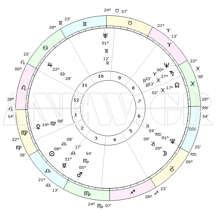 | ΘΕΣΕΙΣ ΠΛΑΝΗΤΩΝ ΑΣΤΡΟΛΟΓΙΚΟΥ ΧΑΡΤΗ ΤΗΣ ΣΤΙΓΜΗΣ ΑΥΤΗΣ | | Πλανήτης | Ζώδιο | Μοίρες | Δεκαήμ. | Σε οίκο | Απόκλιση | | Ακμές των οίκων | Ηλιος | Ζυγός | 08°02' | Πρώτο | 3 | 03 S 11 | | 1ος | 00°42' | Λέων | Σελήνη | Αιγόκερως | 18°56' | Δεύτερο | 6 | 26 S 34 | | 2ος | 21°47' | Λέων | Ερμής | Ζυγός | 21°07' | Τρίτο | 4 | 08 S 20 | | 3ος | 16°56' | Παρθένος | Αφροδίτη | Παρθένος | 14°01' | Δεύτερο | 2 | 07 N 28 | | 4ος | 18°03' | Ζυγός | Αρης | Σκορπιός | 05°50' | Πρώτο | 4 | 13 S 32 | | 5ος | 24°05' | Σκορπιός | Δίας | Καρκίνος | 22°28' | Τρίτο | 12 | 21 N 35 | | 6ος | 29°40' | Τοξότης | Κρόνος | Ιχθείς | 27°54'R | Τρίτο | 9 | 03 S 09 | | 7ος | 00°42' | Υδροχόος | Ουρανός | Δίδυμοι | 01°12'R | Πρώτο | 11 | 20 N 11 | | 8ος | 21°47' | Υδροχόος | Ποσειδώνας | Κριός | 00°33'R | Πρώτο | 9 | 01 S 03 | | 9ος | 16°56' | Ιχθείς | Πλούτωνας | Υδροχόος | 01°24'R | Πρώτο | 7 | 23 S 32 | | 10ος | 18°03' | Κριός | Β. Δεσμός | Ιχθείς | 17°03' | Δεύτερο | 9 | 05 S 07 | | 11ος | 24°05' | Ταύρος | Ωροσκόπος | Λέων | 00°42' | Πρώτο | | | 12ος | 29°40' | Δίδυμοι | Μεσουράνημα | Κριός | 18°03' | Δεύτερο | | | |