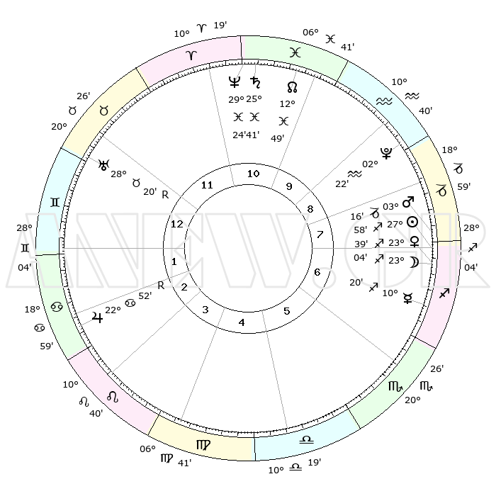 | | ΘΕΣΕΙΣ ΠΛΑΝΗΤΩΝ ΑΣΤΡΟΛΟΓΙΚΟΥ ΧΑΡΤΗ ΤΗΣ ΣΤΙΓΜΗΣ ΑΥΤΗΣ | | | | Πλανήτης | Ζώδιο | Μοίρες | Δεκαήμ. | Σε οίκο | Απόκλιση | | Ακμές των οίκων | | Ηλιος | Τοξότης | 27°54' | Τρίτο | 8 | 23 S 25 | | 1ος | 01°41' | Δίδυμοι | | Σελήνη | Τοξότης | 22°14' | Τρίτο | 7 | 28 S 07 | | 2ος | 26°09' | Δίδυμοι | | Ερμής | Τοξότης | 10°14' | Δεύτερο | 7 | 21 S 02 | | 3ος | 17°31' | Καρκίνος | | Αφροδίτη | Τοξότης | 23°34' | Τρίτο | 7 | 23 S 18 | | 4ος | 10°25' | Λέων | | Αρης | Αιγόκερως | 03°13' | Πρώτο | 8 | 24 S 12 | | 5ος | 09°10' | Παρθένος | | Δίας | Καρκίνος | 22°53'R | Τρίτο | 3 | 21 N 42 | | 6ος | 17°52' | Ζυγός | | Κρόνος | Ιχθείς | 25°41' | Τρίτο | 11 | 03 S 50 | | 7ος | 01°41' | Τοξότης | | Ουρανός | Ταύρος | 28°20'R | Τρίτο | 12 | 19 N 35 | | 8ος | 26°09' | Τοξότης | | Ποσειδώνας | Ιχθείς | 29°24' | Τρίτο | 11 | 01 S 28 | | 9ος | 17°31' | Αιγόκερως | | Πλούτωνας | Υδροχόος | 02°22' | Πρώτο | 9 | 23 S 18 | | 10ος | 10°25' | Υδροχόος | | Β. Δεσμός | Ιχθείς | 12°50' | Δεύτερο | 11 | 06 S 45 | | 11ος | 09°10' | Ιχθείς | | Ωροσκόπος | Δίδυμοι | 01°41' | Πρώτο | | | 12ος | 17°52' | Κριός | | Μεσουράνημα | Υδροχόος | 10°25' | Δεύτερο | | | |