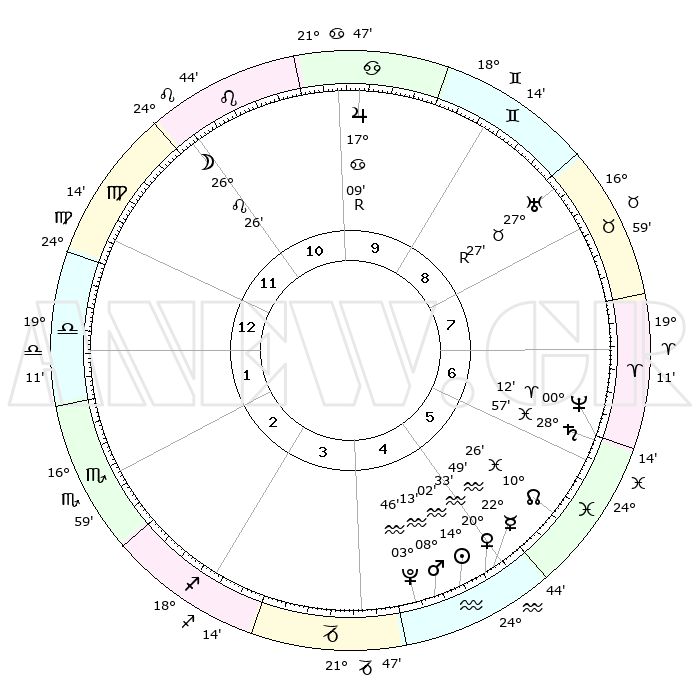 | | ΘΕΣΕΙΣ ΠΛΑΝΗΤΩΝ ΑΣΤΡΟΛΟΓΙΚΟΥ ΧΑΡΤΗ ΤΗΣ ΣΤΙΓΜΗΣ ΑΥΤΗΣ | | | | Πλανήτης | Ζώδιο | Μοίρες | Δεκαήμ. | Σε οίκο | Απόκλιση | | Ακμές των οίκων | | Ηλιος | Υδροχόος | 13°59' | Δεύτερο | 5 | 16 S 38 | | 1ος | 04°04' | Ζυγός | | Σελήνη | Λέων | 25°43' | Τρίτο | 11 | 14 N 05 | | 2ος | 00°56' | Σκορπιός | | Ερμής | Υδροχόος | 22°43' | Τρίτο | 5 | 15 S 36 | | 3ος | 01°32' | Τοξότης | | Αφροδίτη | Υδροχόος | 20°29' | Τρίτο | 5 | 15 S 58 | | 4ος | 04°34' | Αιγόκερως | | Αρης | Υδροχόος | 08°10' | Πρώτο | 5 | 19 S 14 | | 5ος | 07°31' | Υδροχόος | | Δίας | Καρκίνος | 17°09'R | Δεύτερο | 10 | 22 N 38 | | 6ος | 07°47' | Ιχθείς | | Κρόνος | Ιχθείς | 28°56' | Τρίτο | 6 | 02 S 25 | | 7ος | 04°04' | Κριός | | Ουρανός | Ταύρος | 27°27'R | Τρίτο | 8 | 19 N 24 | | 8ος | 00°56' | Ταύρος | | Ποσειδώνας | Κριός | 00°12' | Πρώτο | 6 | 01 S 08 | | 9ος | 01°32' | Δίδυμοι | | Πλούτωνας | Υδροχόος | 03°46' | Πρώτο | 4 | 23 S 01 | | 10ος | 04°34' | Καρκίνος | | Β. Δεσμός | Ιχθείς | 10°26' | Δεύτερο | 6 | 07 S 39 | | 11ος | 07°31' | Λέων | | Ωροσκόπος | Ζυγός | 04°04' | Πρώτο | | | 12ος | 07°47' | Παρθένος | | Μεσουράνημα | Καρκίνος | 04°34' | Πρώτο | | | |