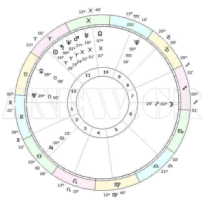 | | ΘΕΣΕΙΣ ΠΛΑΝΗΤΩΝ ΑΣΤΡΟΛΟΓΙΚΟΥ ΧΑΡΤΗ ΤΗΣ ΣΤΙΓΜΗΣ ΑΥΤΗΣ | | | | Πλανήτης | Ζώδιο | Μοίρες | Δεκαήμ. | Σε οίκο | Απόκλιση | | Ακμές των οίκων | | Ηλιος | Κριός | 16°25' | Δεύτερο | 12 | 06 N 27 | | 1ος | 06°38' | Ταύρος | | Σελήνη | Τοξότης | 02°45' | Πρώτο | 7 | 25 S 45 | | 2ος | 07°03' | Δίδυμοι | | Ερμής | Ιχθείς | 18°47' | Δεύτερο | 11 | 06 S 16 | | 3ος | 29°58' | Δίδυμοι | | Αφροδίτη | Ταύρος | 08°03' | Πρώτο | 1 | 13 N 59 | | 4ος | 21°43' | Καρκίνος | | Αρης | Ιχθείς | 27°12' | Τρίτο | 12 | 02 S 03 | | 5ος | 16°49' | Λέων | | Δίας | Καρκίνος | 16°10' | Δεύτερο | 3 | 22 N 50 | | 6ος | 20°52' | Παρθένος | | Κρόνος | Κριός | 06°18' | Πρώτο | 12 | 00 N 33 | | 7ος | 06°38' | Σκορπιός | | Ουρανός | Ταύρος | 28°60' | Τρίτο | 1 | 19 N 46 | | 8ος | 07°03' | Τοξότης | | Ποσειδώνας | Κριός | 02°24' | Πρώτο | 12 | 00 S 15 | | 9ος | 29°58' | Τοξότης | | Πλούτωνας | Υδροχόος | 05°18' | Πρώτο | 10 | 22 S 47 | | 10ος | 21°43' | Αιγόκερως | | Β. Δεσμός | Ιχθείς | 07°08' | Πρώτο | 11 | 08 S 54 | | 11ος | 16°49' | Υδροχόος | | Ωροσκόπος | Ταύρος | 06°38' | Πρώτο | | | 12ος | 20°52' | Ιχθείς | | Μεσουράνημα | Αιγόκερως | 21°43' | Τρίτο | | | |