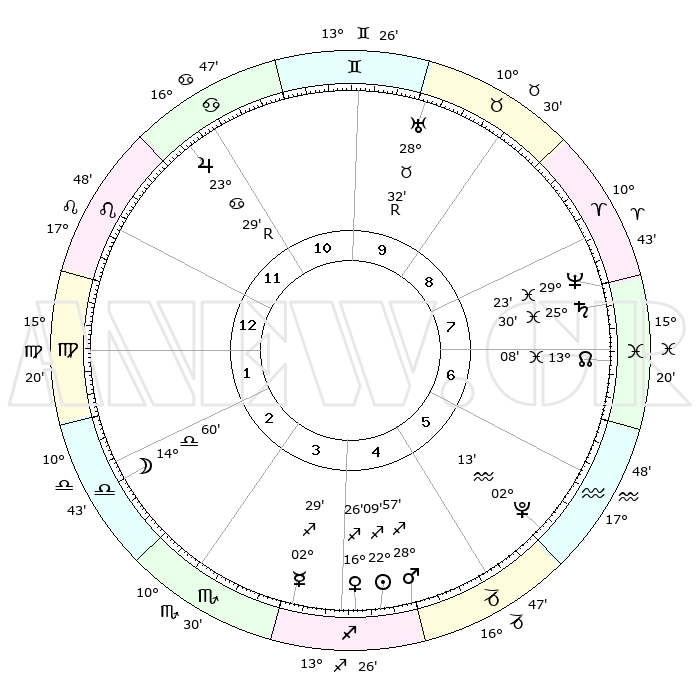 | | ΘΕΣΕΙΣ ΠΛΑΝΗΤΩΝ ΑΣΤΡΟΛΟΓΙΚΟΥ ΧΑΡΤΗ ΤΗΣ ΣΤΙΓΜΗΣ ΑΥΤΗΣ | | | | Πλανήτης | Ζώδιο | Μοίρες | Δεκαήμ. | Σε οίκο | Απόκλιση | | Ακμές των οίκων | | Ηλιος | Τοξότης | 22°03' | Τρίτο | 5 | 23 S 12 | | 1ος | 19°13' | Λέων | | Σελήνη | Ζυγός | 13°55' | Δεύτερο | 3 | 07 S 52 | | 2ος | 11°57' | Παρθένος | | Ερμής | Τοξότης | 02°22' | Πρώτο | 4 | 18 S 59 | | 3ος | 09°30' | Ζυγός | | Αφροδίτη | Τοξότης | 16°20' | Δεύτερο | 4 | 22 S 31 | | 4ος | 12°08' | Σκορπιός | | Αρης | Τοξότης | 28°53' | Τρίτο | 5 | 24 S 12 | | 5ος | 17°06' | Τοξότης | | Δίας | Καρκίνος | 23°29'R | Τρίτο | 12 | 21 N 35 | | 6ος | 20°05' | Αιγόκερως | | Κρόνος | Ιχθείς | 25°30' | Τρίτο | 8 | 03 S 55 | | 7ος | 19°13' | Υδροχόος | | Ουρανός | Ταύρος | 28°32'R | Τρίτο | 10 | 19 N 38 | | 8ος | 11°57' | Ιχθείς | | Ποσειδώνας | Ιχθείς | 29°23' | Τρίτο | 8 | 01 S 29 | | 9ος | 09°30' | Κριός | | Πλούτωνας | Υδροχόος | 02°13' | Πρώτο | 6 | 23 S 20 | | 10ος | 12°08' | Ταύρος | | Β. Δεσμός | Ιχθείς | 13°08' | Δεύτερο | 8 | 06 S 38 | | 11ος | 17°06' | Δίδυμοι | | Ωροσκόπος | Λέων | 19°13' | Δεύτερο | | | 12ος | 20°05' | Καρκίνος | | Μεσουράνημα | Ταύρος | 12°08' | Δεύτερο | | | |