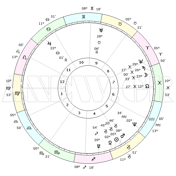 | | ΘΕΣΕΙΣ ΠΛΑΝΗΤΩΝ ΑΣΤΡΟΛΟΓΙΚΟΥ ΧΑΡΤΗ ΤΗΣ ΣΤΙΓΜΗΣ ΑΥΤΗΣ | | | | Πλανήτης | Ζώδιο | Μοίρες | Δεκαήμ. | Σε οίκο | Απόκλιση | | Ακμές των οίκων | | Ηλιος | Αιγόκερως | 05°14' | Πρώτο | 5 | 23 S 20 | | 1ος | 14°25' | Λέων | | Σελήνη | Ιχθείς | 22°21' | Τρίτο | 8 | 02 S 08 | | 2ος | 06°40' | Παρθένος | | Ερμής | Τοξότης | 20°45' | Τρίτο | 5 | 23 S 04 | | 3ος | 03°38' | Ζυγός | | Αφροδίτη | Αιγόκερως | 02°38' | Πρώτο | 5 | 23 S 43 | | 4ος | 06°01' | Σκορπιός | | Αρης | Αιγόκερως | 08°42' | Πρώτο | 5 | 24 S 00 | | 5ος | 11°20' | Τοξότης | | Δίας | Καρκίνος | 22°01'R | Τρίτο | 12 | 21 N 51 | | 6ος | 14°54' | Αιγόκερως | | Κρόνος | Ιχθείς | 26°00' | Τρίτο | 8 | 03 S 41 | | 7ος | 14°25' | Υδροχόος | | Ουρανός | Ταύρος | 28°06'R | Τρίτο | 10 | 19 N 32 | | 8ος | 06°40' | Ιχθείς | | Ποσειδώνας | Ιχθείς | 29°27' | Τρίτο | 8 | 01 S 27 | | 9ος | 03°38' | Κριός | | Πλούτωνας | Υδροχόος | 02°34' | Πρώτο | 6 | 23 S 15 | | 10ος | 06°01' | Ταύρος | | Β. Δεσμός | Ιχθείς | 12°27' | Δεύτερο | 8 | 06 S 53 | | 11ος | 11°20' | Δίδυμοι | | Ωροσκόπος | Λέων | 14°25' | Δεύτερο | | | 12ος | 14°54' | Καρκίνος | | Μεσουράνημα | Ταύρος | 06°01' | Πρώτο | | | |