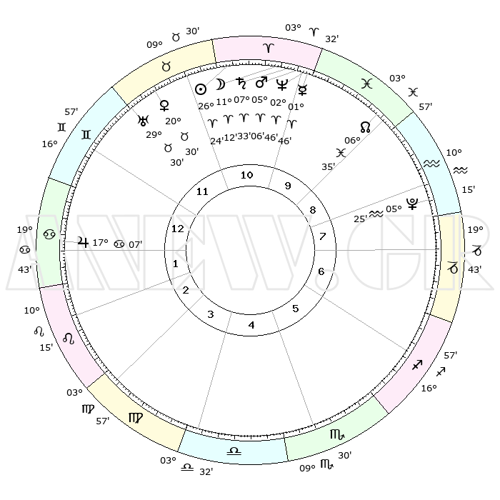 | | ΘΕΣΕΙΣ ΠΛΑΝΗΤΩΝ ΑΣΤΡΟΛΟΓΙΚΟΥ ΧΑΡΤΗ ΤΗΣ ΣΤΙΓΜΗΣ ΑΥΤΗΣ | | | | Πλανήτης | Ζώδιο | Μοίρες | Δεκαήμ. | Σε οίκο | Απόκλιση | | Ακμές των οίκων | | Ηλιος | Κριός | 26°19' | Τρίτο | 11 | 10 N 09 | | 1ος | 25°14' | Δίδυμοι | | Σελήνη | Κριός | 10°06' | Δεύτερο | 11 | 06 N 30 | | 2ος | 16°22' | Καρκίνος | | Ερμής | Κριός | 01°39' | Πρώτο | 10 | 01 S 45 | | 3ος | 07°54' | Λέων | | Αφροδίτη | Ταύρος | 20°25' | Τρίτο | 12 | 18 N 04 | | 4ος | 03°29' | Παρθένος | | Αρης | Κριός | 05°03' | Πρώτο | 10 | 01 N 06 | | 5ος | 06°38' | Ζυγός | | Δίας | Καρκίνος | 17°06' | Δεύτερο | 2 | 22 N 43 | | 6ος | 16°52' | Σκορπιός | | Κρόνος | Κριός | 07°32' | Πρώτο | 11 | 01 N 01 | | 7ος | 25°14' | Τοξότης | | Ουρανός | Ταύρος | 29°29' | Τρίτο | 12 | 19 N 52 | | 8ος | 16°22' | Αιγόκερως | | Ποσειδώνας | Κριός | 02°46' | Πρώτο | 10 | 00 S 06 | | 9ος | 07°54' | Υδροχόος | | Πλούτωνας | Υδροχόος | 05°25' | Πρώτο | 8 | 22 S 47 | | 10ος | 03°29' | Ιχθείς | | Β. Δεσμός | Ιχθείς | 06°36' | Πρώτο | 10 | 09 S 05 | | 11ος | 06°38' | Κριός | | Ωροσκόπος | Δίδυμοι | 25°14' | Τρίτο | | | 12ος | 16°52' | Ταύρος | | Μεσουράνημα | Ιχθείς | 03°29' | Πρώτο | | | |