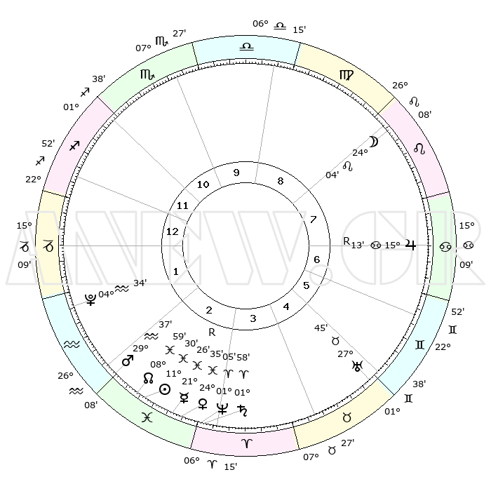 | | ΘΕΣΕΙΣ ΠΛΑΝΗΤΩΝ ΑΣΤΡΟΛΟΓΙΚΟΥ ΧΑΡΤΗ ΤΗΣ ΣΤΙΓΜΗΣ ΑΥΤΗΣ | | | | Πλανήτης | Ζώδιο | Μοίρες | Δεκαήμ. | Σε οίκο | Απόκλιση | | Ακμές των οίκων | | Ηλιος | Ιχθείς | 11°26' | Δεύτερο | 3 | 07 S 16 | | 1ος | 22°39' | Τοξότης | | Σελήνη | Λέων | 23°10' | Τρίτο | 8 | 15 N 09 | | 2ος | 28°00' | Αιγόκερως | | Ερμής | Ιχθείς | 21°28'R | Τρίτο | 3 | 00 S 13 | | 3ος | 07°17' | Ιχθείς | | Αφροδίτη | Ιχθείς | 24°30' | Τρίτο | 3 | 03 S 25 | | 4ος | 12°16' | Κριός | | Αρης | Υδροχόος | 29°34' | Τρίτο | 2 | 12 S 39 | | 5ος | 09°47' | Ταύρος | | Δίας | Καρκίνος | 15°13'R | Δεύτερο | 7 | 22 N 54 | | 6ος | 02°10' | Δίδυμοι | | Κρόνος | Κριός | 01°58' | Πρώτο | 3 | 01 S 11 | | 7ος | 22°39' | Δίδυμοι | | Ουρανός | Ταύρος | 27°45' | Τρίτο | 5 | 19 N 29 | | 8ος | 28°00' | Καρκίνος | | Ποσειδώνας | Κριός | 01°05' | Πρώτο | 3 | 00 S 46 | | 9ος | 07°17' | Παρθένος | | Πλούτωνας | Υδροχόος | 04°34' | Πρώτο | 2 | 22 S 52 | | 10ος | 12°16' | Ζυγός | | Β. Δεσμός | Ιχθείς | 08°59' | Πρώτο | 3 | 08 S 12 | | 11ος | 09°47' | Σκορπιός | | Ωροσκόπος | Τοξότης | 22°39' | Τρίτο | | | 12ος | 02°10' | Τοξότης | | Μεσουράνημα | Ζυγός | 12°16' | Δεύτερο | | | |
