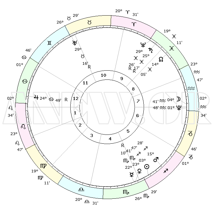| | ΘΕΣΕΙΣ ΠΛΑΝΗΤΩΝ ΑΣΤΡΟΛΟΓΙΚΟΥ ΧΑΡΤΗ ΤΗΣ ΣΤΙΓΜΗΣ ΑΥΤΗΣ | | | | Πλανήτης | Ζώδιο | Μοίρες | Δεκαήμ. | Σε οίκο | Απόκλιση | | Ακμές των οίκων | | Ηλιος | Τοξότης | 03°42' | Πρώτο | 5 | 20 S 53 | | 1ος | 10°19' | Καρκίνος | | Σελήνη | Υδροχόος | 03°46' | Πρώτο | 8 | 22 S 29 | | 2ος | 00°45' | Λέων | | Ερμής | Σκορπιός | 22°13'R | Τρίτο | 5 | 16 S 21 | | 3ος | 23°24' | Λέων | | Αφροδίτη | Σκορπιός | 23°35' | Τρίτο | 5 | 17 S 48 | | 4ος | 21°26' | Παρθένος | | Αρης | Τοξότης | 15°25' | Δεύτερο | 6 | 23 S 15 | | 5ος | 26°44' | Ζυγός | | Δίας | Καρκίνος | 24°49'R | Τρίτο | 1 | 21 N 18 | | 6ος | 05°38' | Τοξότης | | Κρόνος | Ιχθείς | 25°17'R | Τρίτο | 10 | 04 S 04 | | 7ος | 10°19' | Αιγόκερως | | Ουρανός | Ταύρος | 29°16'R | Τρίτο | 11 | 19 N 47 | | 8ος | 00°45' | Υδροχόος | | Ποσειδώνας | Ιχθείς | 29°26'R | Τρίτο | 10 | 01 S 28 | | 9ος | 23°24' | Υδροχόος | | Πλούτωνας | Υδροχόος | 01°48' | Πρώτο | 8 | 23 S 26 | | 10ος | 21°26' | Ιχθείς | | Β. Δεσμός | Ιχθείς | 14°05' | Δεύτερο | 9 | 06 S 15 | | 11ος | 26°44' | Κριός | | Ωροσκόπος | Καρκίνος | 10°19' | Δεύτερο | | | 12ος | 05°38' | Δίδυμοι | | Μεσουράνημα | Ιχθείς | 21°26' | Τρίτο | | | |