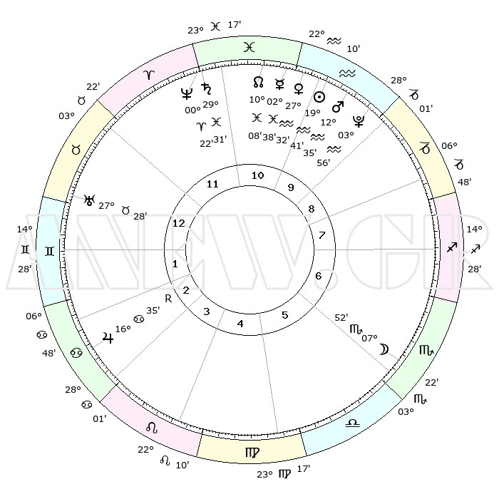 | | ΘΕΣΕΙΣ ΠΛΑΝΗΤΩΝ ΑΣΤΡΟΛΟΓΙΚΟΥ ΧΑΡΤΗ ΤΗΣ ΣΤΙΓΜΗΣ ΑΥΤΗΣ | | | | Πλανήτης | Ζώδιο | Μοίρες | Δεκαήμ. | Σε οίκο | Απόκλιση | | Ακμές των οίκων | | Ηλιος | Υδροχόος | 19°37' | Δεύτερο | 10 | 14 S 56 | | 1ος | 16°16' | Ταύρος | | Σελήνη | Σκορπιός | 07°04' | Πρώτο | 6 | 18 S 04 | | 2ος | 14°11' | Δίδυμοι | | Ερμής | Ιχθείς | 02°31' | Πρώτο | 11 | 11 S 39 | | 3ος | 06°20' | Καρκίνος | | Αφροδίτη | Υδροχόος | 27°27' | Τρίτο | 11 | 13 S 43 | | 4ος | 28°21' | Καρκίνος | | Αρης | Υδροχόος | 12°32' | Δεύτερο | 10 | 18 S 04 | | 5ος | 24°40' | Λέων | | Δίας | Καρκίνος | 16°36'R | Δεύτερο | 3 | 22 N 43 | | 6ος | 00°38' | Ζυγός | | Κρόνος | Ιχθείς | 29°31' | Τρίτο | 11 | 02 S 11 | | 7ος | 16°16' | Σκορπιός | | Ουρανός | Ταύρος | 27°28' | Τρίτο | 1 | 19 N 24 | | 8ος | 14°11' | Τοξότης | | Ποσειδώνας | Κριός | 00°21' | Πρώτο | 11 | 01 S 04 | | 9ος | 06°20' | Αιγόκερως | | Πλούτωνας | Υδροχόος | 03°56' | Πρώτο | 10 | 22 S 59 | | 10ος | 28°21' | Αιγόκερως | | Β. Δεσμός | Ιχθείς | 10°08' | Δεύτερο | 11 | 07 S 46 | | 11ος | 24°40' | Υδροχόος | | Ωροσκόπος | Ταύρος | 16°16' | Δεύτερο | | | 12ος | 00°38' | Κριός | | Μεσουράνημα | Αιγόκερως | 28°21' | Τρίτο | | | |