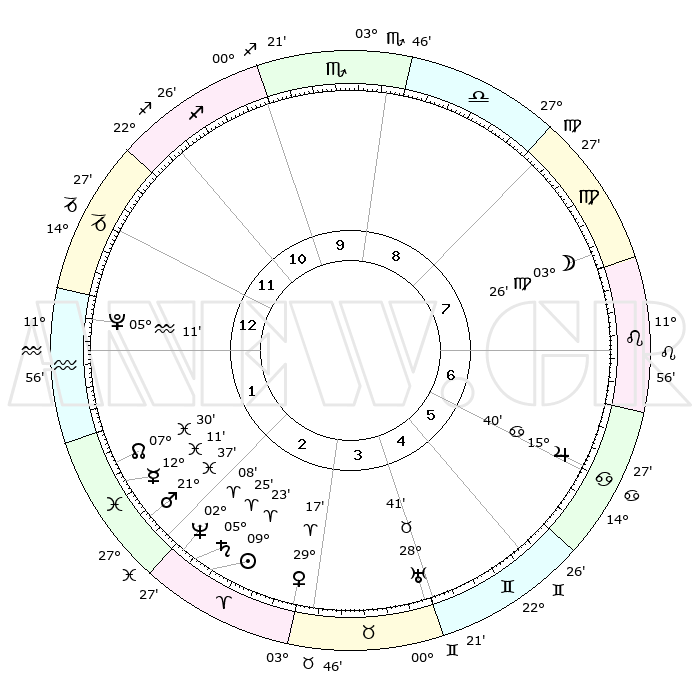 | | ΘΕΣΕΙΣ ΠΛΑΝΗΤΩΝ ΑΣΤΡΟΛΟΓΙΚΟΥ ΧΑΡΤΗ ΤΗΣ ΣΤΙΓΜΗΣ ΑΥΤΗΣ | | | | Πλανήτης | Ζώδιο | Μοίρες | Δεκαήμ. | Σε οίκο | Απόκλιση | | Ακμές των οίκων | | Ηλιος | Κριός | 09°18' | Πρώτο | 3 | 03 N 41 | | 1ος | 09°07' | Αιγόκερως | | Σελήνη | Παρθένος | 02°22' | Πρώτο | 8 | 11 N 10 | | 2ος | 18°36' | Υδροχόος | | Ερμής | Ιχθείς | 12°07' | Δεύτερο | 2 | 07 S 55 | | 3ος | 28°54' | Ιχθείς | | Αφροδίτη | Κριός | 29°11' | Τρίτο | 3 | 10 N 41 | | 4ος | 01°15' | Ταύρος | | Αρης | Ιχθείς | 21°33' | Τρίτο | 2 | 04 S 19 | | 5ος | 26°12' | Ταύρος | | Δίας | Καρκίνος | 15°39' | Δεύτερο | 7 | 22 N 53 | | 6ος | 17°34' | Δίδυμοι | | Κρόνος | Κριός | 05°25' | Πρώτο | 3 | 00 N 12 | | 7ος | 09°07' | Καρκίνος | | Ουρανός | Ταύρος | 28°41' | Τρίτο | 5 | 19 N 42 | | 8ος | 18°36' | Λέων | | Ποσειδώνας | Κριός | 02°08' | Πρώτο | 3 | 00 S 21 | | 9ος | 28°54' | Παρθένος | | Πλούτωνας | Υδροχόος | 05°11' | Πρώτο | 1 | 22 S 48 | | 10ος | 01°15' | Σκορπιός | | Β. Δεσμός | Ιχθείς | 07°31' | Πρώτο | 2 | 08 S 45 | | 11ος | 26°12' | Σκορπιός | | Ωροσκόπος | Αιγόκερως | 09°07' | Πρώτο | | | 12ος | 17°34' | Τοξότης | | Μεσουράνημα | Σκορπιός | 01°15' | Πρώτο | | | |