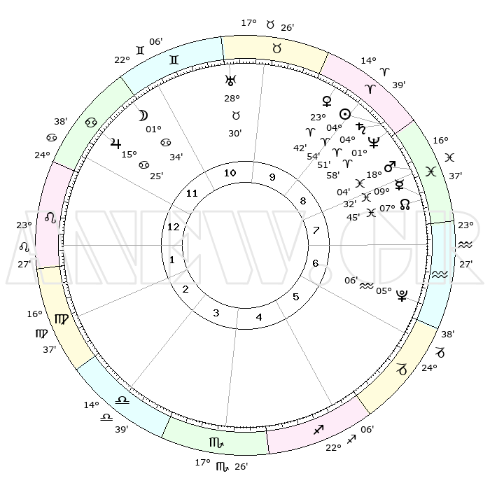 | | ΘΕΣΕΙΣ ΠΛΑΝΗΤΩΝ ΑΣΤΡΟΛΟΓΙΚΟΥ ΧΑΡΤΗ ΤΗΣ ΣΤΙΓΜΗΣ ΑΥΤΗΣ | | | | Πλανήτης | Ζώδιο | Μοίρες | Δεκαήμ. | Σε οίκο | Απόκλιση | | Ακμές των οίκων | | Ηλιος | Κριός | 05°09' | Πρώτο | 5 | 02 N 03 | | 1ος | 05°41' | Σκορπιός | | Σελήνη | Καρκίνος | 05°03' | Πρώτο | 8 | 28 N 01 | | 2ος | 04°28' | Τοξότης | | Ερμής | Ιχθείς | 09°38' | Πρώτο | 4 | 08 S 06 | | 3ος | 06°55' | Αιγόκερως | | Αφροδίτη | Κριός | 24°00' | Τρίτο | 6 | 08 N 40 | | 4ος | 11°30' | Υδροχόος | | Αρης | Ιχθείς | 18°16' | Δεύτερο | 5 | 05 S 37 | | 5ος | 14°19' | Ιχθείς | | Δίας | Καρκίνος | 15°26' | Δεύτερο | 9 | 22 N 54 | | 6ος | 12°26' | Κριός | | Κρόνος | Κριός | 04°53' | Πρώτο | 5 | 00 S 01 | | 7ος | 05°41' | Ταύρος | | Ουρανός | Ταύρος | 28°30' | Τρίτο | 7 | 19 N 39 | | 8ος | 04°28' | Δίδυμοι | | Ποσειδώνας | Κριός | 01°59' | Πρώτο | 5 | 00 S 25 | | 9ος | 06°55' | Καρκίνος | | Πλούτωνας | Υδροχόος | 05°07' | Πρώτο | 3 | 22 S 48 | | 10ος | 11°30' | Λέων | | Β. Δεσμός | Ιχθείς | 07°44' | Πρώτο | 4 | 08 S 40 | | 11ος | 14°19' | Παρθένος | | Ωροσκόπος | Σκορπιός | 05°41' | Πρώτο | | | 12ος | 12°26' | Ζυγός | | Μεσουράνημα | Λέων | 11°30' | Δεύτερο | | | |