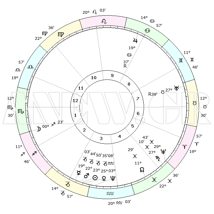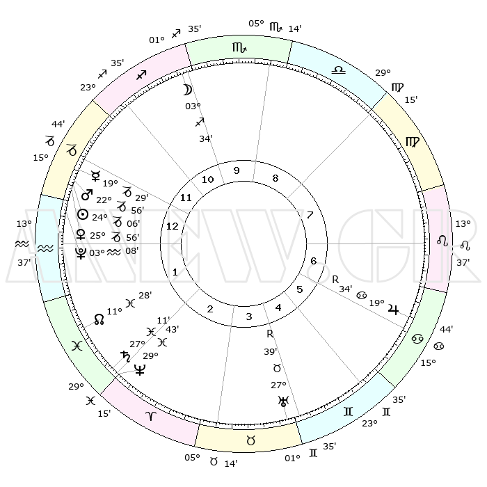 | | ΘΕΣΕΙΣ ΠΛΑΝΗΤΩΝ ΑΣΤΡΟΛΟΓΙΚΟΥ ΧΑΡΤΗ ΤΗΣ ΣΤΙΓΜΗΣ ΑΥΤΗΣ | | | | Πλανήτης | Ζώδιο | Μοίρες | Δεκαήμ. | Σε οίκο | Απόκλιση | | Ακμές των οίκων | | Ηλιος | Αιγόκερως | 24°12' | Τρίτο | 10 | 21 S 16 | | 1ος | 06°13' | Κριός | | Σελήνη | Τοξότης | 04°42' | Πρώτο | 8 | 26 S 05 | | 2ος | 14°57' | Ταύρος | | Ερμής | Αιγόκερως | 19°38' | Δεύτερο | 10 | 23 S 44 | | 3ος | 11°26' | Δίδυμοι | | Αφροδίτη | Αιγόκερως | 26°03' | Τρίτο | 10 | 21 S 53 | | 4ος | 03°30' | Καρκίνος | | Αρης | Αιγόκερως | 23°00' | Τρίτο | 10 | 22 S 26 | | 5ος | 26°06' | Καρκίνος | | Δίας | Καρκίνος | 19°34'R | Δεύτερο | 4 | 22 N 16 | | 6ος | 24°30' | Λέων | | Κρόνος | Ιχθείς | 27°12' | Τρίτο | 12 | 03 S 09 | | 7ος | 06°13' | Ζυγός | | Ουρανός | Ταύρος | 27°38'R | Τρίτο | 2 | 19 N 26 | | 8ος | 14°57' | Σκορπιός | | Ποσειδώνας | Ιχθείς | 29°43' | Τρίτο | 12 | 01 S 20 | | 9ος | 11°26' | Τοξότης | | Πλούτωνας | Υδροχόος | 03°08' | Πρώτο | 11 | 23 S 08 | | 10ος | 03°30' | Αιγόκερως | | Β. Δεσμός | Ιχθείς | 11°28' | Δεύτερο | 12 | 07 S 16 | | 11ος | 26°06' | Αιγόκερως | | Ωροσκόπος | Κριός | 06°13' | Πρώτο | | | 12ος | 24°30' | Υδροχόος | | Μεσουράνημα | Αιγόκερως | 03°30' | Πρώτο | | | |