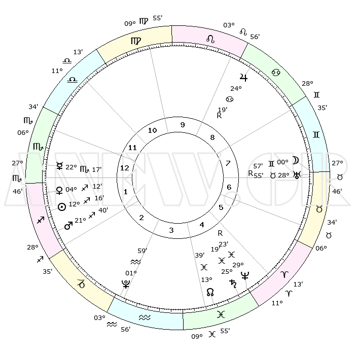 | | ΘΕΣΕΙΣ ΠΛΑΝΗΤΩΝ ΑΣΤΡΟΛΟΓΙΚΟΥ ΧΑΡΤΗ ΤΗΣ ΣΤΙΓΜΗΣ ΑΥΤΗΣ | | | | Πλανήτης | Ζώδιο | Μοίρες | Δεκαήμ. | Σε οίκο | Απόκλιση | | Ακμές των οίκων | | Ηλιος | Τοξότης | 12°48' | Δεύτερο | 6 | 22 S 20 | | 1ος | 09°32' | Καρκίνος | | Σελήνη | Δίδυμοι | 09°00' | Πρώτο | 12 | 26 N 43 | | 2ος | 29°58' | Καρκίνος | | Ερμής | Σκορπιός | 22°39' | Τρίτο | 5 | 15 S 58 | | 3ος | 22°33' | Λέων | | Αφροδίτη | Τοξότης | 04°52' | Πρώτο | 6 | 20 S 33 | | 4ος | 20°27' | Παρθένος | | Αρης | Τοξότης | 22°04' | Τρίτο | 6 | 23 S 53 | | 5ος | 25°40' | Ζυγός | | Δίας | Καρκίνος | 24°17'R | Τρίτο | 1 | 21 N 25 | | 6ος | 04°41' | Τοξότης | | Κρόνος | Ιχθείς | 25°19' | Τρίτο | 10 | 04 S 01 | | 7ος | 09°32' | Αιγόκερως | | Ουρανός | Ταύρος | 28°54'R | Τρίτο | 11 | 19 N 42 | | 8ος | 29°59' | Αιγόκερως | | Ποσειδώνας | Ιχθείς | 29°23'R | Τρίτο | 10 | 01 S 29 | | 9ος | 22°33' | Υδροχόος | | Πλούτωνας | Υδροχόος | 01°59' | Πρώτο | 8 | 23 S 23 | | 10ος | 20°27' | Ιχθείς | | Β. Δεσμός | Ιχθείς | 13°37' | Δεύτερο | 9 | 06 S 26 | | 11ος | 25°40' | Κριός | | Ωροσκόπος | Καρκίνος | 09°32' | Πρώτο | | | 12ος | 04°40' | Δίδυμοι | | Μεσουράνημα | Ιχθείς | 20°27' | Τρίτο | | | |