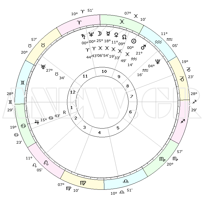 | | ΘΕΣΕΙΣ ΠΛΑΝΗΤΩΝ ΑΣΤΡΟΛΟΓΙΚΟΥ ΧΑΡΤΗ ΤΗΣ ΣΤΙΓΜΗΣ ΑΥΤΗΣ | | | | Πλανήτης | Ζώδιο | Μοίρες | Δεκαήμ. | Σε οίκο | Απόκλιση | | Ακμές των οίκων | | Ηλιος | Ιχθείς | 00°45' | Πρώτο | 10 | 11 S 12 | | 1ος | 03°38' | Δίδυμοι | | Σελήνη | Ιχθείς | 24°11' | Τρίτο | 11 | 01 S 02 | | 2ος | 27°44' | Δίδυμοι | | Ερμής | Ιχθείς | 18°50' | Δεύτερο | 11 | 03 S 25 | | 3ος | 19°03' | Καρκίνος | | Αφροδίτη | Ιχθείς | 11°14' | Δεύτερο | 11 | 08 S 42 | | 4ος | 12°06' | Λέων | | Αρης | Υδροχόος | 21°11' | Τρίτο | 10 | 15 S 28 | | 5ος | 11°12' | Παρθένος | | Δίας | Καρκίνος | 15°43'R | Δεύτερο | 2 | 22 N 50 | | 6ος | 20°11' | Ζυγός | | Κρόνος | Κριός | 00°43' | Πρώτο | 11 | 01 S 41 | | 7ος | 03°38' | Τοξότης | | Ουρανός | Ταύρος | 27°34' | Τρίτο | 12 | 19 N 26 | | 8ος | 27°44' | Τοξότης | | Ποσειδώνας | Κριός | 00°43' | Πρώτο | 11 | 00 S 55 | | 9ος | 19°03' | Αιγόκερως | | Πλούτωνας | Υδροχόος | 04°16' | Πρώτο | 9 | 22 S 55 | | 10ος | 12°06' | Υδροχόος | | Β. Δεσμός | Ιχθείς | 09°33' | Πρώτο | 10 | 07 S 59 | | 11ος | 11°12' | Ιχθείς | | Ωροσκόπος | Δίδυμοι | 03°38' | Πρώτο | | | 12ος | 20°11' | Κριός | | Μεσουράνημα | Υδροχόος | 12°06' | Δεύτερο | | | |