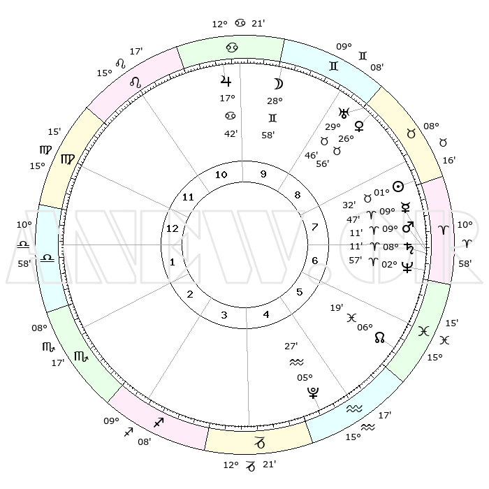 | | ΘΕΣΕΙΣ ΠΛΑΝΗΤΩΝ ΑΣΤΡΟΛΟΓΙΚΟΥ ΧΑΡΤΗ ΤΗΣ ΣΤΙΓΜΗΣ ΑΥΤΗΣ | | | | Πλανήτης | Ζώδιο | Μοίρες | Δεκαήμ. | Σε οίκο | Απόκλιση | | Ακμές των οίκων | | Ηλιος | Ταύρος | 00°56' | Πρώτο | 2 | 11 N 48 | | 1ος | 09°11' | Υδροχόος | | Σελήνη | Δίδυμοι | 19°45' | Δεύτερο | 4 | 28 N 00 | | 2ος | 24°28' | Ιχθείς | | Ερμής | Κριός | 08°47' | Πρώτο | 2 | 01 N 05 | | 3ος | 01°19' | Ταύρος | | Αφροδίτη | Ταύρος | 26°10' | Τρίτο | 3 | 19 N 43 | | 4ος | 28°18' | Ταύρος | | Αρης | Κριός | 08°42' | Πρώτο | 2 | 02 N 34 | | 5ος | 20°30' | Δίδυμοι | | Δίας | Καρκίνος | 17°38' | Δεύτερο | 6 | 22 N 39 | | 6ος | 12°21' | Καρκίνος | | Κρόνος | Κριός | 08°06' | Πρώτο | 2 | 01 N 14 | | 7ος | 09°11' | Λέων | | Ουρανός | Ταύρος | 29°44' | Τρίτο | 4 | 19 N 56 | | 8ος | 24°28' | Παρθένος | | Ποσειδώνας | Κριός | 02°56' | Πρώτο | 2 | 00 S 02 | | 9ος | 01°19' | Σκορπιός | | Πλούτωνας | Υδροχόος | 05°27' | Πρώτο | 12 | 22 S 48 | | 10ος | 28°18' | Σκορπιός | | Β. Δεσμός | Ιχθείς | 06°21' | Πρώτο | 1 | 09 S 11 | | 11ος | 20°30' | Τοξότης | | Ωροσκόπος | Υδροχόος | 09°11' | Πρώτο | | | 12ος | 12°21' | Αιγόκερως | | Μεσουράνημα | Σκορπιός | 28°18' | Τρίτο | | | |